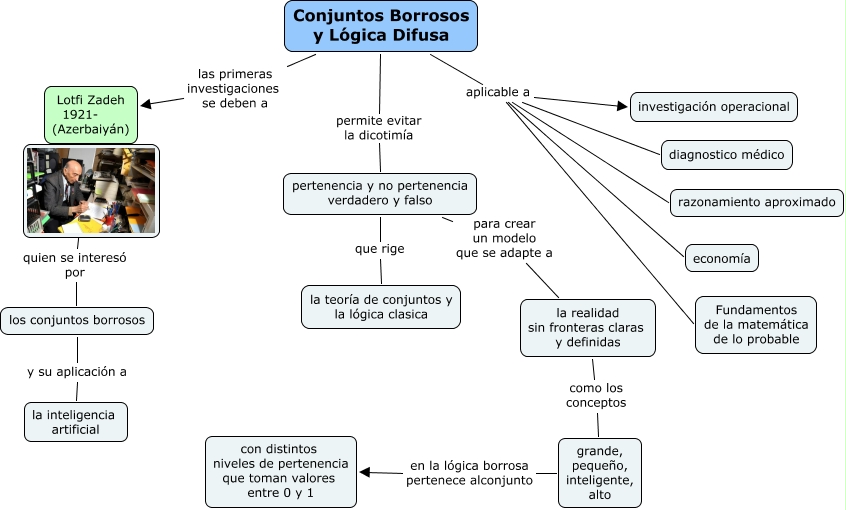 Este Cmap, tiene información relacionada con: Conjuntos borrosos y lógica difusa, Conjuntos Borrosos y Lógica Difusa aplicable a razonamiento aproximado, Conjuntos Borrosos y Lógica Difusa las primeras investigaciones se deben a Lotfi Zadeh 1921- (Azerbaiyán), Conjuntos Borrosos y Lógica Difusa aplicable a investigación operacional, Conjuntos Borrosos y Lógica Difusa aplicable a diagnostico médico, Conjuntos Borrosos y Lógica Difusa aplicable a economía, Lotfi Zadeh 1921- (Azerbaiyán) quien se interesó por los conjuntos borrosos, Conjuntos Borrosos y Lógica Difusa aplicable a Fundamentos de la matemática de lo probable, grande, pequeño, inteligente, alto en la lógica borrosa pertenece alconjunto con distintos niveles de pertenencia que toman valores entre 0 y 1, pertenencia y no pertenencia verdadero y falso que rige la teoría de conjuntos y la lógica clasica, pertenencia y no pertenencia verdadero y falso para crear un modelo que se adapte a la realidad sin fronteras claras y definidas, los conjuntos borrosos y su aplicación a la inteligencia artificial, Conjuntos Borrosos y Lógica Difusa permite evitar la dicotimía pertenencia y no pertenencia verdadero y falso, la realidad sin fronteras claras y definidas como los conceptos grande, pequeño, inteligente, alto