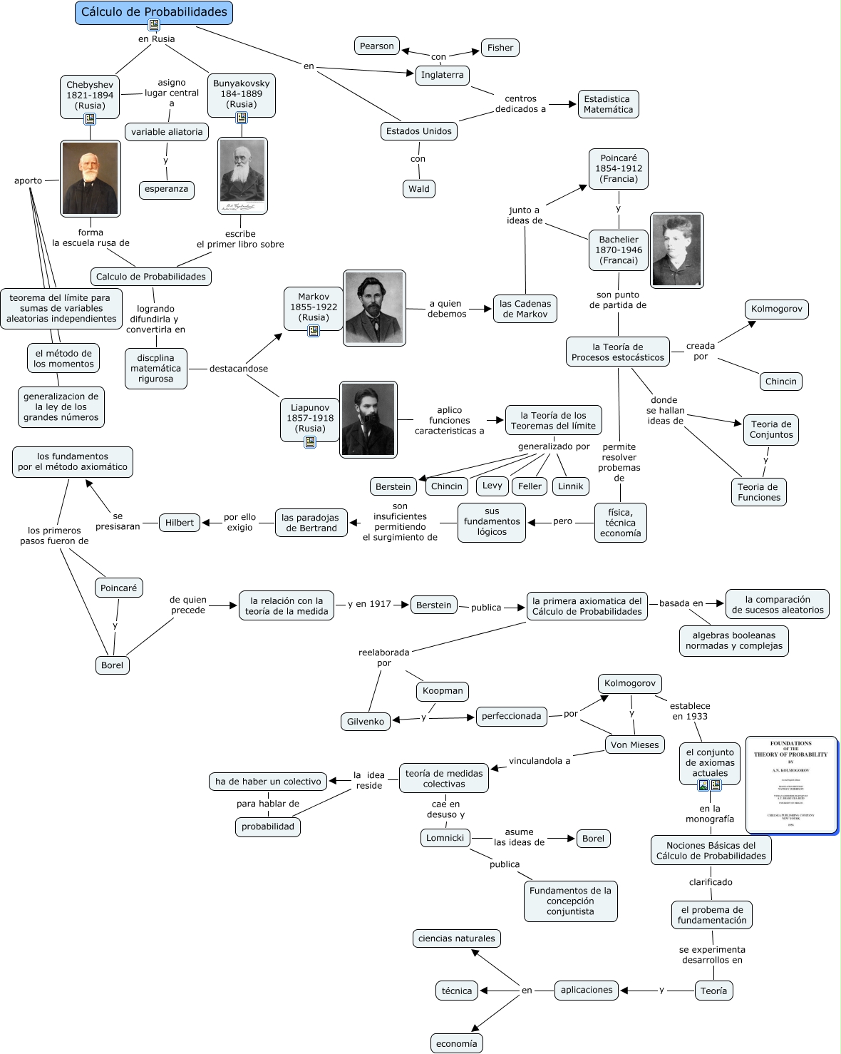 Este Cmap, tiene información relacionada con: 2 Calculo de Probabilidades, aporto teorema del límite para sumas de variables aleatorias independientes, Liapunov 1857-1918 (Rusia) aplico funciones caracteristicas a la Teoría de los Teoremas del límite, perfeccionada por Kolmogorov, las Cadenas de Markov junto a ideas de Poincaré 1854-1912 (Francia), la Teoría de los Teoremas del límite generalizado por Feller, discplina matemática rigurosa destacandose Liapunov 1857-1918 (Rusia), los fundamentos por el método axiomático los primeros pasos fueron de Poincaré, la Teoría de Procesos estocásticos creada por Kolmogorov, Cálculo de Probabilidades en Rusia Bunyakovsky 184-1889 (Rusia), la relación con la teoría de la medida y en 1917 Berstein, Lomnicki asume las ideas de Borel, Estados Unidos con Wald, la Teoría de los Teoremas del límite generalizado por Berstein, Koopman y Gilvenko, Von Mieses vinculandola a teoría de medidas colectivas, Teoria de Conjuntos y Teoria de Funciones, Inglaterra con Fisher, aporto generalizacion de la ley de los grandes números, Bachelier 1870-1946 (Francai) son punto de partida de la Teoría de Procesos estocásticos, el conjunto de axiomas actuales en la monografía Nociones Básicas del Cálculo de Probabilidades