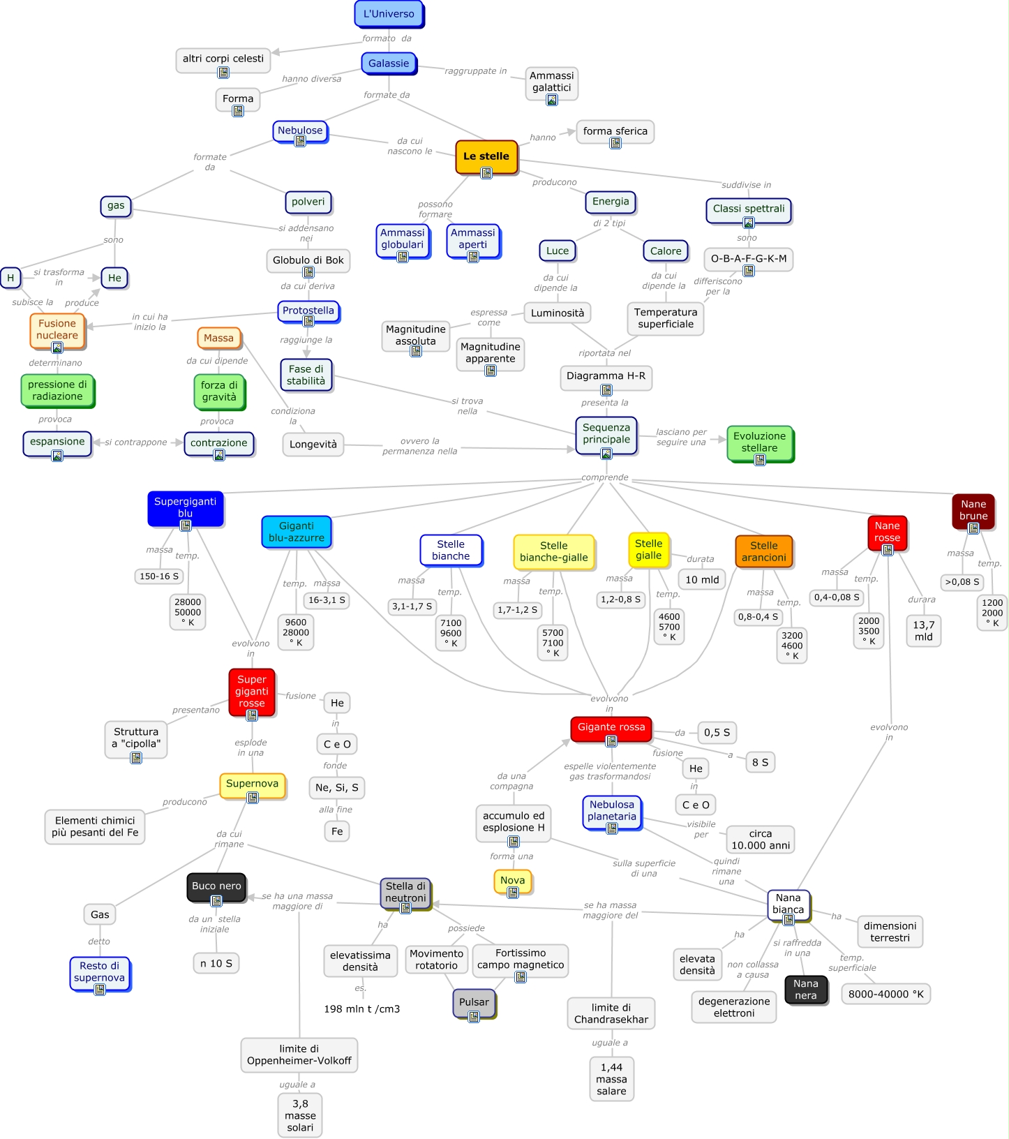 Questa Cmap, creata con IHMC CmapTools, contiene informazioni relative a: Le stelle, accumulo ed esplosione H forma una Nova, Classi spettrali sono O-B-A-F-G-K-M, Le stelle producono Energia, C e O fonde Ne, Si, S, Nane rosse evolvono in Nana bianca, Massa da cui dipende forza di gravità, Gigante rossa fusione He, Super giganti rosse presentano Struttura a "cipolla", Giganti blu-azzurre temp. 9600 28000 ° K, Stelle bianche massa 3,1-1,7 S, Le stelle suddivise in Classi spettrali, Fase di stabilità si trova nella Sequenza principale, Supernova producono Elementi chimici più pesanti del Fe, Giganti blu-azzurre evolvono in Gigante rossa, Super giganti rosse fusione He, Stelle gialle massa 1,2-0,8 S, Nana bianca se ha massa maggiore del limite di Chandrasekhar, Luminosità riportata nel Diagramma H-R, Nebulosa planetaria visibile per circa 10.000 anni, Massa condiziona la Longevità