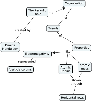 This Concept Map, created with IHMC CmapTools, has information related to: The periodic table, Trends of Properties, Atomic Radius like Electronegativity, Electronegativity represented in Verticle colums, atomic mass like Properties, atomic mass like Electronegativity, atomic mass shown through Horizontal rows, The Periodic Table created by Dimitri Mendeleev, Atomic Radius shown through Horizontal rows, Organization of Trends, Atomic Radius like Properties, The Periodic Table an Organization