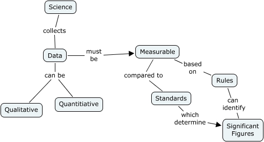 This Concept Map, created with IHMC CmapTools, has information related to: Science, Science collects Data, Data must be Measurable, Rules can identify Significant Figures, Data can be Qualitative, Measurable compared to Standards, Measurable based on Rules, Data can be Quantitiative, Standards which determine Significant Figures