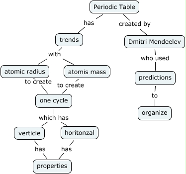 This Concept Map, created with IHMC CmapTools, has information related to: Periodic Table, Periodic Table created by Dmitri Mendeelev, Dmitri Mendeelev who used predictions, one cycle which has horitonzal, horitonzal has properties, atomis mass to create one cycle, verticle has properties, predictions to organize, trends with atomic radius, trends with atomis mass, atomic radius to create one cycle, one cycle which has verticle, Periodic Table has trends