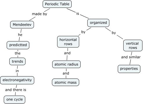 This Concept Map, created with IHMC CmapTools, has information related to: Periodic table, Mendeelev he predictted, vertical rows and similar properties, atomic radius and atomic mass, Periodic Table made by Mendeelev, electronegativity and there is one cycle, horizontal rows and atomic radius, Periodic Table is organized, predictted the trends, organized by horizontal rows, organized by vertical rows, trends in electronegativity