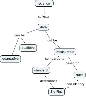 This Concept Map, created with IHMC CmapTools, has information related to: science, measurable based on rules, data must be measurable, measurable compared to standard, standard determines Sig Figs, science collects data, data can be qualitive, rules can identify Sig Figs, data can be quantative