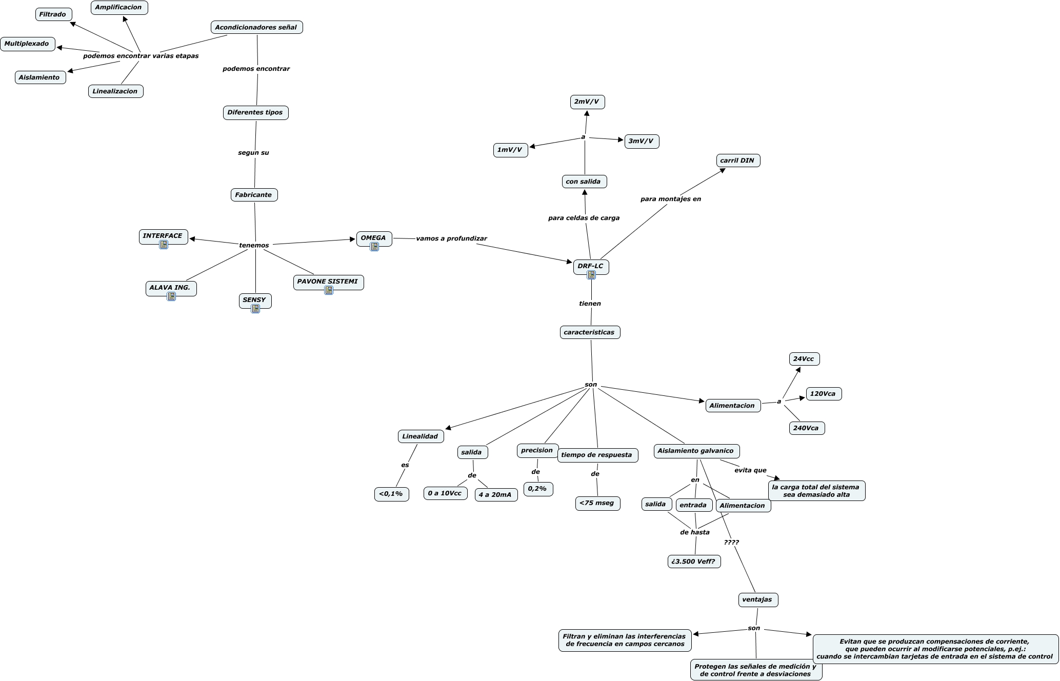 Este Cmap, tiene información relacionada con: acondicionador señal, DRF-LC para celdas de carga con salida, Acondicionadores señal podemos encontrar varias etapas Aislamiento, Aislamiento galvanico en salida, con salida a 3mV/V, ventajas son Filtran y eliminan las interferencias de frecuencia en campos cercanos, ventajas son Evitan que se produzcan compensaciones de corriente, que pueden ocurrir al modificarse potenciales, p.ej.: cuando se intercambian tarjetas de entrada en el sistema de control, Fabricante tenemos SENSY, Fabricante tenemos INTERFACE, tiempo de respuesta de ុ mseg, caracteristicas son precision, con salida a 2mV/V, DRF-LC tienen caracteristicas, Fabricante tenemos OMEGA, salida de hasta ¿3.500 Veff?, Acondicionadores señal podemos encontrar varias etapas Amplificacion, DRF-LC para montajes en carril DIN, caracteristicas son Aislamiento galvanico, Acondicionadores señal podemos encontrar varias etapas Filtrado, caracteristicas son tiempo de respuesta, Acondicionadores señal podemos encontrar varias etapas Multiplexado