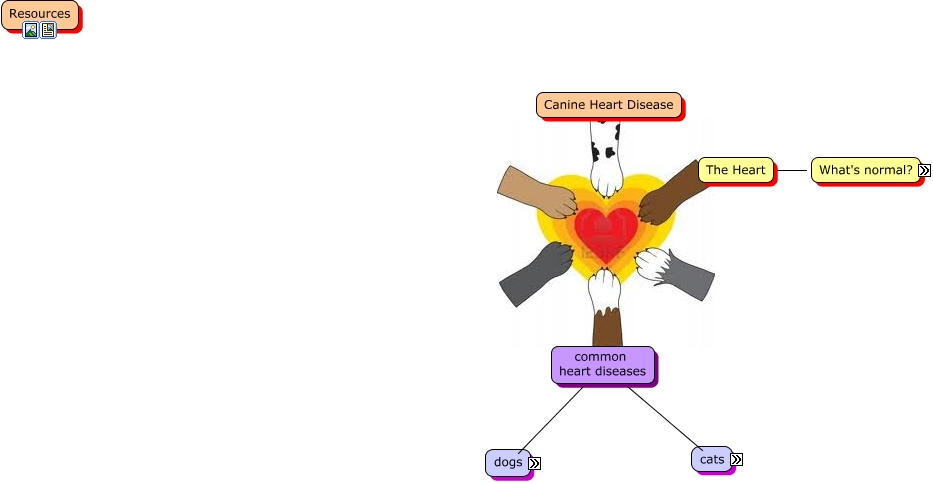 This Concept Map, created with IHMC CmapTools, has information related to: Canine Heart Disease, common heart diseases cats Hypertrophic cardiomyopathy (most common), common heart diseases dogs Cardiomyopathy, right heart failure (most commonly ascites in dogs) most common clinical signs Decreased energy Cough Syncope, elevated left atrial pressure results in elevated pulmonary capillary pressures if the elevation is high enough (ie, ᡌ mm Hg) cardiogenic pulmonary edema (ie, left heart failure), common heart diseases dogs link with cardiac diseases and CS, Valvular degeneration Mitral mital and tricuspid, Valvular degeneration Tricuspid mital and tricuspid, 2 ???? 3, Normal Function 1, Cardiomyopathy CS Weight loss (wks) Affected dogs are lethargic, tire easily, breathe rapidly cough frequently sometimes bringing up bloody sputum. ( Coughing is especially common at night.) A swollen abdomen (called ascites) (Cardiac arrhythmias can cause weakness and collapse.), 1 ???? 2, nodular thickening of the cardiac valve leaflets or cusps, most severely at their tips what does that do? Insufficiency of an atrioventricular (AV) valve results in turbulent, systolic (ie, during ventricular contraction) flow through the affected valve. This regurgitation of blood into an atrium results in an increase in volume within the atrium and thus to an increase in atrial chamber size. When regurgitation is severe, atrial pressure may also increase., chronic increase in left atrial size and pressure can also result in left atrial rupture and acute cardiac tamponade, often resulting in death. most common clinical signs Decreased energy Cough Syncope, Valvular degeneration Tricuspid severe regurgitation, cardiogenic pulmonary edema (ie, left heart failure) chronic chronic increase in left atrial size and pressure can also result in left atrial rupture and acute cardiac tamponade, often resulting in death., Valvular degeneration what is it nodular thickening of the cardiac valve leaflets or cusps, most severely at their tips, increase in the thickness of the muscular wall of the heart. This reduces the volume of blood within the heart and also prevents the heart muscle relaxing properly between contractions. Most common clinical signs Urination/hiding/vomition/behavior Tachypnea/dyspnea Murmur Gallop heart sounds/arrhythmias, Hypertrophic cardiomyopathy (most common) what is it increase in the thickness of the muscular wall of the heart. This reduces the volume of blood within the heart and also prevents the heart muscle relaxing properly between contractions., common heart diseases cats link, Valvular degeneration Mitral elevated left atrial pressure results in elevated pulmonary capillary pressures