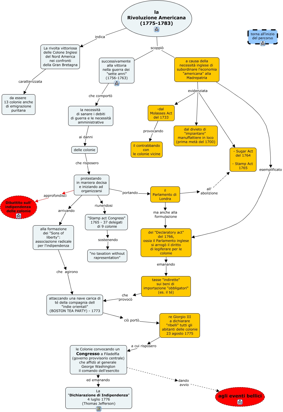 Questa Cmap, creata con IHMC CmapTools, contiene informazioni relative a: rivolu ame, del "Declaratory act" del 1766, ossia il Parlamento inglese si arrogò il diritto di legiferare per le colonie emanando tasse "indirette" sui beni di importazione "obbligatori" (es. il té), protestando in maniera decisa e iniziando ad organizzarsi arrivando alla formazione dei "Sons of liberty": associazione radicale per l'indipendenza, delle colonie che risposero protestando in maniera decisa e iniziando ad organizzarsi, re Giorgio III a dichiarare "ribelli" tutti gli abitanti delle colonie 23 agosto 1775 a cui risposero le Colonie convocando un Congresso a Filadelfia (governo provvisorio centrale) che affidò al generale George Washington il comando dell'esercito, a causa della necessità inglese di subordinare l'economia "americana" alla Madrepatria esemplificato del "Declaratory act" del 1766, ossia il Parlamento inglese si arrogò il diritto di legiferare per le colonie, "Stamp act Congress" 1765 - 37 delegati di 9 colonie sostenendo "no taxation without rapresentation", le Colonie convocando un Congresso a Filadelfia (governo provvisorio centrale) che affidò al generale George Washington il comando dell'esercito dando avvio agli eventi bellici, tasse "indirette" sui beni di importazione "obbligatori" (es. il té) che provocò attaccando una nave carica di té della compagnia dell "indie orientali" (BOSTON TEA PARTY) - 1773, attaccando una nave carica di té della compagnia dell "indie orientali" (BOSTON TEA PARTY) - 1773 ciò portò re Giorgio III a dichiarare "ribelli" tutti gli abitanti delle colonie 23 agosto 1775, il Parlamento di Londra all' abolizione - Sugar Act del 1764 - Stamp Act 1765, protestando in maniera decisa e iniziando ad organizzarsi riunendosi "Stamp act Congress" 1765 - 37 delegati di 9 colonie, a causa della necessità inglese di subordinare l'economia "americana" alla Madrepatria evidenziata - Sugar Act del 1764 - Stamp Act 1765, le Colonie convocando un Congresso a Filadelfia (governo provvisorio centrale) che affidò al generale George Washington il comando dell'esercito ed emanando La "Dichiarazione di Indipendenza" 4 luglio 1776 (Thomas Jefferson), alla formazione dei "Sons of liberty": associazione radicale per l'indipendenza che agirono attaccando una nave carica di té della compagnia dell "indie orientali" (BOSTON TEA PARTY) - 1773, la Rivoluzione Americana (1775-1783) scoppiò successivamente alla vittoria nella guerra dei "sette anni" (1756-1763), la necessità di sanare i debiti di guerra e le necessità amministrative ai danni delle colonie, La rivolta vittoriosa delle Colone Inglesi del Nord America nei confronti della Gran Bretagna caratterizzata da essere 13 colonie anche di emigrazione puritana, la Rivoluzione Americana (1775-1783) scoppiò a causa della necessità inglese di subordinare l'economia "americana" alla Madrepatria, successivamente alla vittoria nella guerra dei "sette anni" (1756-1763) che comportò la necessità di sanare i debiti di guerra e le necessità amministrative, a causa della necessità inglese di subordinare l'economia "americana" alla Madrepatria evidenziata dal divieto di "impiantare" manuffattiere in loco (prima metà del 1700)