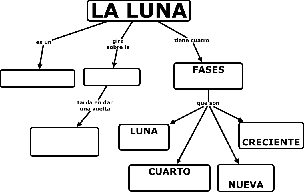 Este Cmap, tiene información relacionada con: luna incompleto, LA LUNA tiene cuatro FASES, LA LUNA es un, FASES que son NUEVA, FASES que son CRECIENTE, LA LUNA gira sobre la, tarda en dar una vuelta, FASES que son CUARTO, FASES que son LUNA