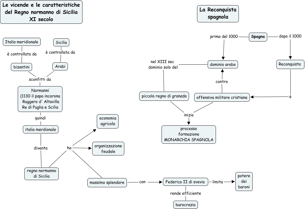 Questa Cmap, creata con IHMC CmapTools, contiene informazioni relative a: normanni e spagnoli, Italia meridionale è controllata da bizantini, dominio arabo nel XIII sec dominio solo del piccolo regno di granada, regno normanno di Sicilia ha massimo splendore, Spagna prima del 1000 dominio arabo, italia merdionale diventa regno normanno di Sicilia, Sicilia è controllata da Arabi, bizantini sconfitti da Normanni (1130 il papa incorona Ruggero d' Altavilla Re di Puglia e Scilia, regno normanno di Sicilia ha economia agricola, Reconquista è offensiva militare cristiana, regno normanno di Sicilia ha organizzazione feudale, Arabi sconfitti da Normanni (1130 il papa incorona Ruggero d' Altavilla Re di Puglia e Scilia, offensiva militare cristiana inizia processo formazione MONARCHIA SPAGNOLA, piccolo regno di granada inizia processo formazione MONARCHIA SPAGNOLA, Federico II di svevia limita potere dei baroni, offensiva militare cristiana contro dominio arabo, Normanni (1130 il papa incorona Ruggero d' Altavilla Re di Puglia e Scilia quindi italia merdionale, Federico II di svevia rende efficiente burocrazia, Spagna dopo il 1000 Reconquista, massimo splendore con Federico II di svevia