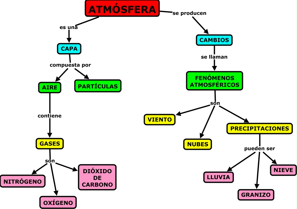 Este Cmap, tiene información relacionada con: atmósfera, FENÓMENOS ATMOSFÉRICOS son PRECIPITACIONES, ATMÓSFERA se producen CAMBIOS, CAPA compuesta por AIRE, CAPA compuesta por PARTÍCULAS, GASES son NITRÓGENO, AIRE contiene GASES, PRECIPITACIONES pueden ser LLUVIA, GASES son OXÍGENO, FENÓMENOS ATMOSFÉRICOS son NUBES, CAMBIOS se llaman FENÓMENOS ATMOSFÉRICOS, GASES son DIÓXIDO DE CARBONO, PRECIPITACIONES pueden ser GRANIZO, ATMÓSFERA es una CAPA, PRECIPITACIONES pueden ser NIEVE, FENÓMENOS ATMOSFÉRICOS son VIENTO
