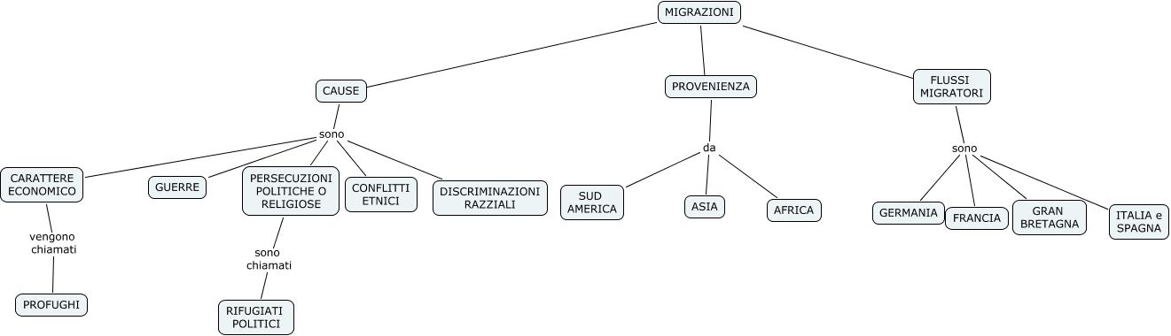 Questa Cmap, creata con IHMC CmapTools, contiene informazioni relative a: Migrazioni, MIGRAZIONI ???? CAUSE, FLUSSI MIGRATORI sono GRAN BRETAGNA, PROVENIENZA da AFRICA, CARATTERE ECONOMICO vengono chiamati PROFUGHI, FLUSSI MIGRATORI sono FRANCIA, PROVENIENZA da ASIA, CAUSE sono GUERRE, FLUSSI MIGRATORI sono GERMANIA, CAUSE sono CONFLITTI ETNICI, MIGRAZIONI ???? FLUSSI MIGRATORI, PERSECUZIONI POLITICHE O RELIGIOSE sono chiamati RIFUGIATI POLITICI, PROVENIENZA da SUD AMERICA, CAUSE sono CARATTERE ECONOMICO, CAUSE sono DISCRIMINAZIONI RAZZIALI, CAUSE sono PERSECUZIONI POLITICHE O RELIGIOSE, MIGRAZIONI ???? PROVENIENZA, FLUSSI MIGRATORI sono ITALIA e SPAGNA