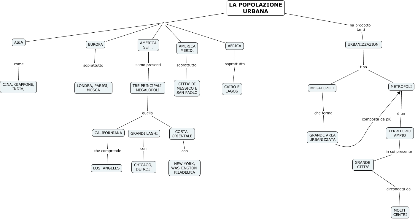 Questa Cmap, creata con IHMC CmapTools, contiene informazioni relative a: popolazione urbana, COSTA ORIENTALE con NEW YORK, WASHINGTON FILADELFIA, LA POPOLAZIONE URBANA in AFRICA, LA POPOLAZIONE URBANA in AMERICA MERID., AMERICA SETT. somo presenti TRE PRINCIPALI MEGALOPOLI, LA POPOLAZIONE URBANA in ASIA, TRE PRINCIPALI MEGALOPOLI quella COSTA ORIENTALE, EUROPA soprattutto LONDRA, PARIGI, MOSCA, TRE PRINCIPALI MEGALOPOLI quella CALIFORNIANA, LA POPOLAZIONE URBANA ha prodotto tanti URBANIZZAZIONi, MEGALOPOLI che forma GRANDE AREA URBANIZZATA, LA POPOLAZIONE URBANA in AMERICA SETT., AMERICA MERID. soprattutto CITTA' DI MESSICO E SAN PAOLO, METROPOLI è un TERRITORIO AMPIO, URBANIZZAZIONi tipo METROPOLI, GRANDI LAGHI con CHICAGO, DETROIT, URBANIZZAZIONi tipo MEGALOPOLI, GRANDE AREA URBANIZZATA composta da più METROPOLI, LA POPOLAZIONE URBANA in EUROPA, CALIFORNIANA che comprende LOS ANGELES, ASIA come CINA, GIAPPONE, INDIA,