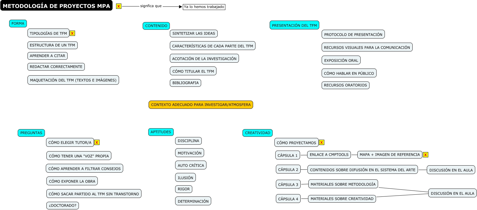 Este Cmap, tiene información relacionada con: Programa Metodología Proyectos MPA.cmap, CÁPSULA 1 ???? ENLACE A CMPTOOLS, X signfica que Ya lo hemos trabajado, MATERIALES SOBRE CREATIVIDAD ???? DISCUSIÓN EN EL AULA, CÁPSULA 2 ???? CONTENIDOS SOBRE DIFUSIÓN EN EL SISTEMA DEL ARTE, MATERIALES SOBRE METODOLOGÍA ???? DISCUSIÓN EN EL AULA, CÁPSULA 4 ???? MATERIALES SOBRE CREATIVIDAD, CONTENIDOS SOBRE DIFUSIÓN EN EL SISTEMA DEL ARTE ???? DISCUSIÓN EN EL AULA, ENLACE A CMPTOOLS ???? MAPA + IMAGEN DE REFERENCIA, CÁPSULA 3 ???? MATERIALES SOBRE METODOLOGÍA