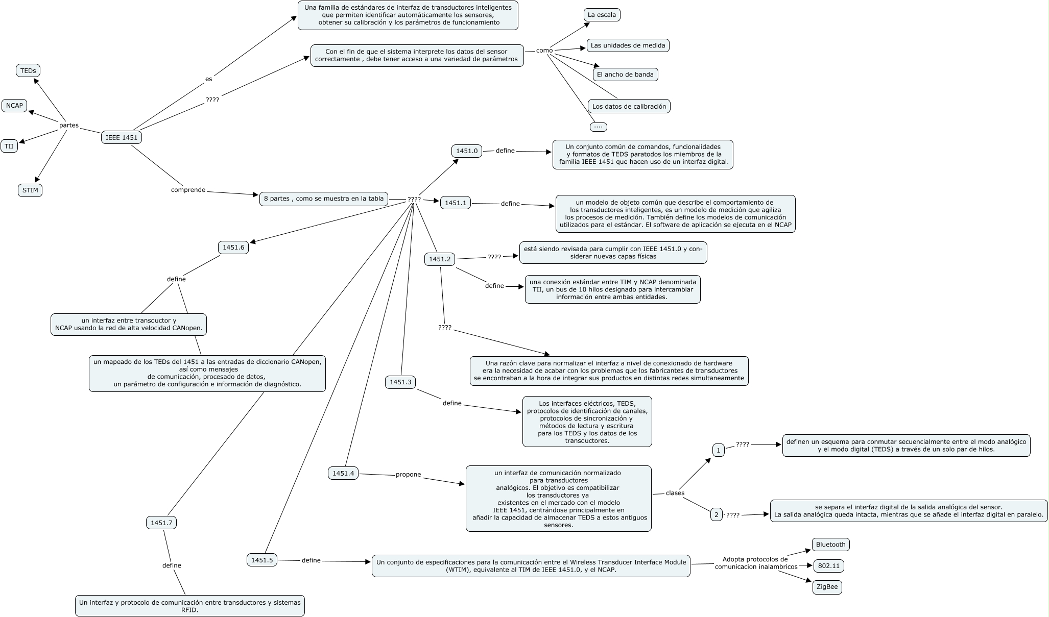 Este Cmap, tiene información relacionada con: IEEE 1451, Con el fin de que el sistema interprete los datos del sensor correctamente , debe tener acceso a una variedad de parámetros como La escala, 1451.5 define Un conjunto de especificaciones para la comunicación entre el Wireless Transducer Interface Module (WTIM), equivalente al TIM de IEEE 1451.0, y el NCAP., 1451.4 propone un interfaz de comunicación normalizado para transductores analógicos. El objetivo es compatibilizar los transductores ya existentes en el mercado con el modelo IEEE 1451, centrándose principalmente en añadir la capacidad de almacenar TEDS a estos antiguos sensores., 1451.0 define Un conjunto común de comandos, funcionalidades y formatos de TEDS paratodos los miembros de la familia IEEE 1451 que hacen uso de un interfaz digital., 1451.6 define un interfaz entre transductor y NCAP usando la red de alta velocidad CANopen., IEEE 1451 partes TII, Con el fin de que el sistema interprete los datos del sensor correctamente , debe tener acceso a una variedad de parámetros como Los datos de calibración, IEEE 1451 partes STIM, Con el fin de que el sistema interprete los datos del sensor correctamente , debe tener acceso a una variedad de parámetros como Las unidades de medida, IEEE 1451 partes TEDs, 1451.2 ???? Una razón clave para normalizar el interfaz a nivel de conexionado de hardware era la necesidad de acabar con los problemas que los fabricantes de transductores se encontraban a la hora de integrar sus productos en distintas redes simultaneamente, Un conjunto de especificaciones para la comunicación entre el Wireless Transducer Interface Module (WTIM), equivalente al TIM de IEEE 1451.0, y el NCAP. Adopta protocolos de comunicacion inalambricos ZigBee, 1451.6 define un mapeado de los TEDs del 1451 a las entradas de diccionario CANopen, así como mensajes de comunicación, procesado de datos, un parámetro de configuración e información de diagnóstico., 8 partes , como se muestra en la tabla ???? 1451.0, 8 partes , como se muestra en la tabla ???? 1451.5, 8 partes , como se muestra en la tabla ???? 1451.3, 1451.7 define Un interfaz y protocolo de comunicación entre transductores y sistemas RFID., Un conjunto de especificaciones para la comunicación entre el Wireless Transducer Interface Module (WTIM), equivalente al TIM de IEEE 1451.0, y el NCAP. Adopta protocolos de comunicacion inalambricos 802.11, 1451.3 define Los interfaces eléctricos, TEDS, protocolos de identificación de canales, protocolos de sincronización y métodos de lectura y escritura para los TEDS y los datos de los transductores., 1451.2 define una conexión estándar entre TIM y NCAP denominada TII, un bus de 10 hilos designado para intercambiar información entre ambas entidades.