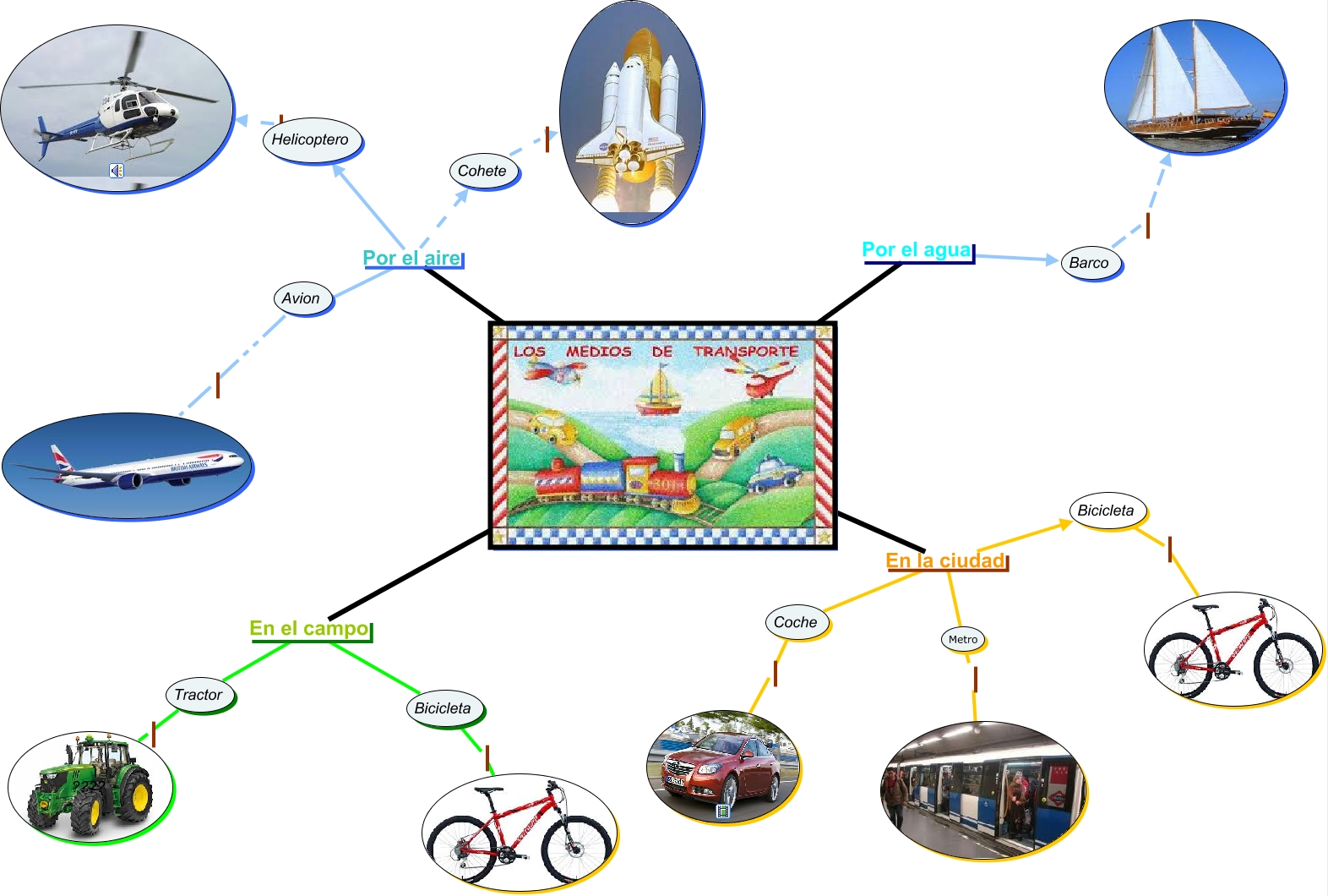 Este Cmap, tiene información relacionada con: Los transportes, Bicicleta, Tractor ????, Cohete, En la ciudad Bicicleta, Barco, En la ciudad Coche, Por el aire Helicoptero, Por el agua Barco, En el campo Bicicleta, Avion, Helicoptero, Bicicleta, Por el aire Cohete, Metro, En el campo Tractor, En la ciudad Metro, Por el aire Avion, Coche