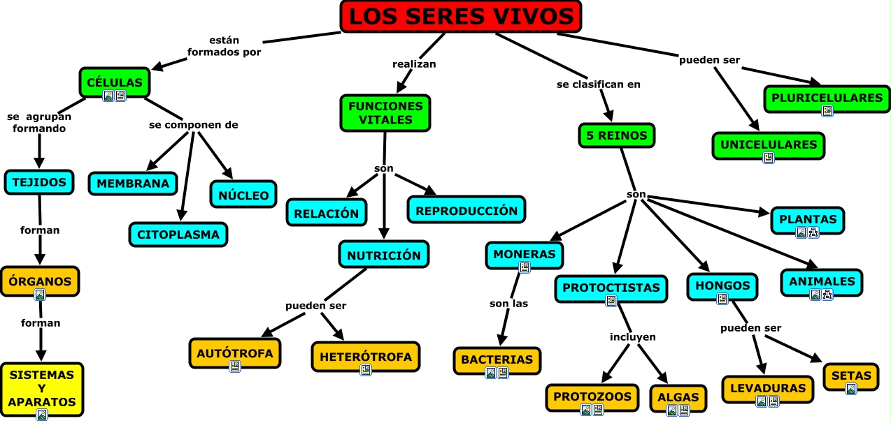 Este Cmap, tiene información relacionada con: seres vivos, MONERAS son las BACTERIAS, 5 REINOS son ANIMALES, CÉLULAS se componen de MEMBRANA, LOS SERES VIVOS pueden ser PLURICELULARES, CÉLULAS se agrupan formando TEJIDOS, ÓRGANOS forman SISTEMAS Y APARATOS, TEJIDOS forman ÓRGANOS, HONGOS pueden ser SETAS, FUNCIONES VITALES son REPRODUCCIÓN, 5 REINOS son HONGOS, 5 REINOS son MONERAS, HONGOS pueden ser LEVADURAS, PROTOCTISTAS incluyen ALGAS, FUNCIONES VITALES son RELACIÓN, CÉLULAS se componen de CITOPLASMA, PROTOCTISTAS incluyen PROTOZOOS, LOS SERES VIVOS están formados por CÉLULAS, LOS SERES VIVOS se clasifican en 5 REINOS, NUTRICIÓN pueden ser HETERÓTROFA, NUTRICIÓN pueden ser AUTÓTROFA