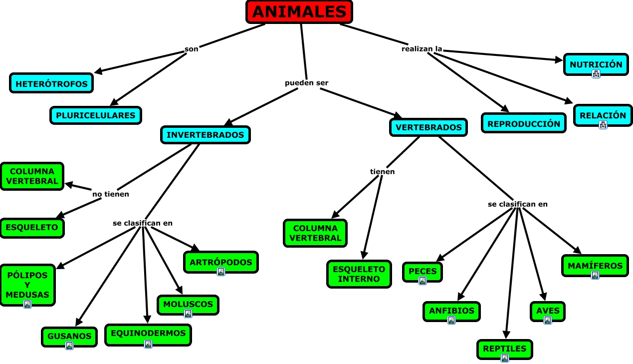 Este Cmap, tiene información relacionada con: animales, VERTEBRADOS se clasifican en PECES, INVERTEBRADOS se clasifican en PÓLIPOS Y MEDUSAS, VERTEBRADOS se clasifican en AVES, ANIMALES son HETERÓTROFOS, ANIMALES pueden ser INVERTEBRADOS, ANIMALES son PLURICELULARES, ANIMALES pueden ser VERTEBRADOS, VERTEBRADOS se clasifican en ANFIBIOS, INVERTEBRADOS se clasifican en ARTRÓPODOS, VERTEBRADOS tienen COLUMNA VERTEBRAL, ANIMALES realizan la REPRODUCCIÓN, INVERTEBRADOS se clasifican en EQUINODERMOS, INVERTEBRADOS no tienen COLUMNA VERTEBRAL, ANIMALES realizan la NUTRICIÓN, INVERTEBRADOS no tienen ESQUELETO, VERTEBRADOS se clasifican en MAM�?FEROS, INVERTEBRADOS se clasifican en MOLUSCOS, VERTEBRADOS tienen ESQUELETO INTERNO, VERTEBRADOS se clasifican en REPTILES, ANIMALES realizan la RELACIÓN