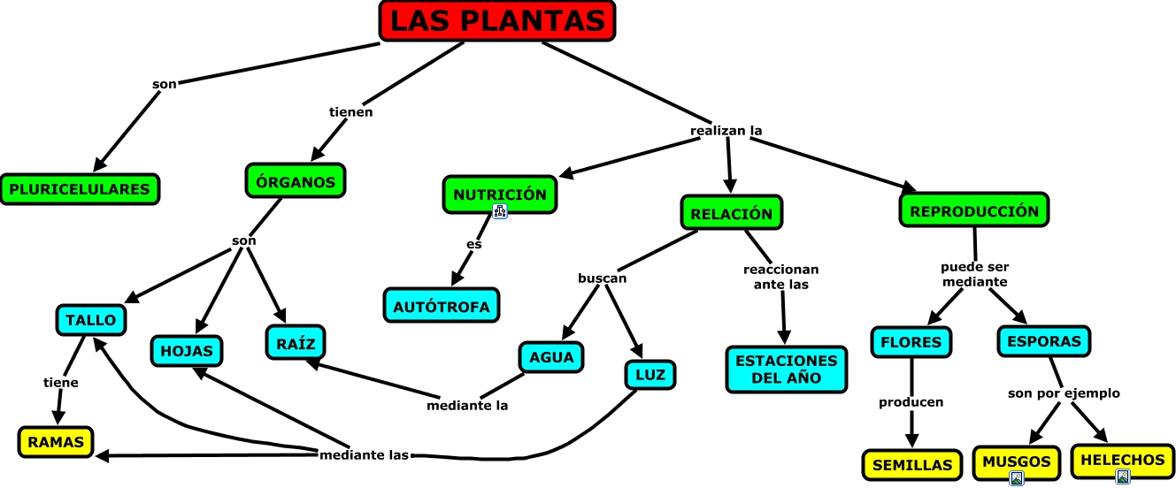 Este Cmap, tiene información relacionada con: PLANTAS, RELACIÓN buscan LUZ, RELACIÓN buscan AGUA, ESPORAS son por ejemplo HELECHOS, LAS PLANTAS realizan la REPRODUCCIÓN, LAS PLANTAS son PLURICELULARES, FLORES producen SEMILLAS, TALLO tiene RAMAS, LAS PLANTAS realizan la NUTRICIÓN, AGUA mediante la RA�?Z, REPRODUCCIÓN puede ser mediante FLORES, LAS PLANTAS tienen ÓRGANOS, ÓRGANOS son TALLO, ESPORAS son por ejemplo MUSGOS, LUZ mediante las RAMAS, ÓRGANOS son HOJAS, LAS PLANTAS realizan la RELACIÓN, RELACIÓN reaccionan ante las ESTACIONES DEL AÑO, ÓRGANOS son RA�?Z, LUZ mediante las TALLO, NUTRICIÓN es AUTÓTROFA