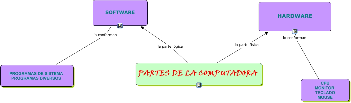 Este Cmap, tiene información relacionada con: PARTES DELA COMPUTADORA, HARDWARE lo conforman CPU MONITOR TECLADO MOUSE, PARTES DE LA COMPUTADORA la parte física HARDWARE, SOFTWARE lo conforman PROGRAMAS DE SISTEMA PROGRAMAS DIVERSOS, PARTES DE LA COMPUTADORA la parte lógica SOFTWARE