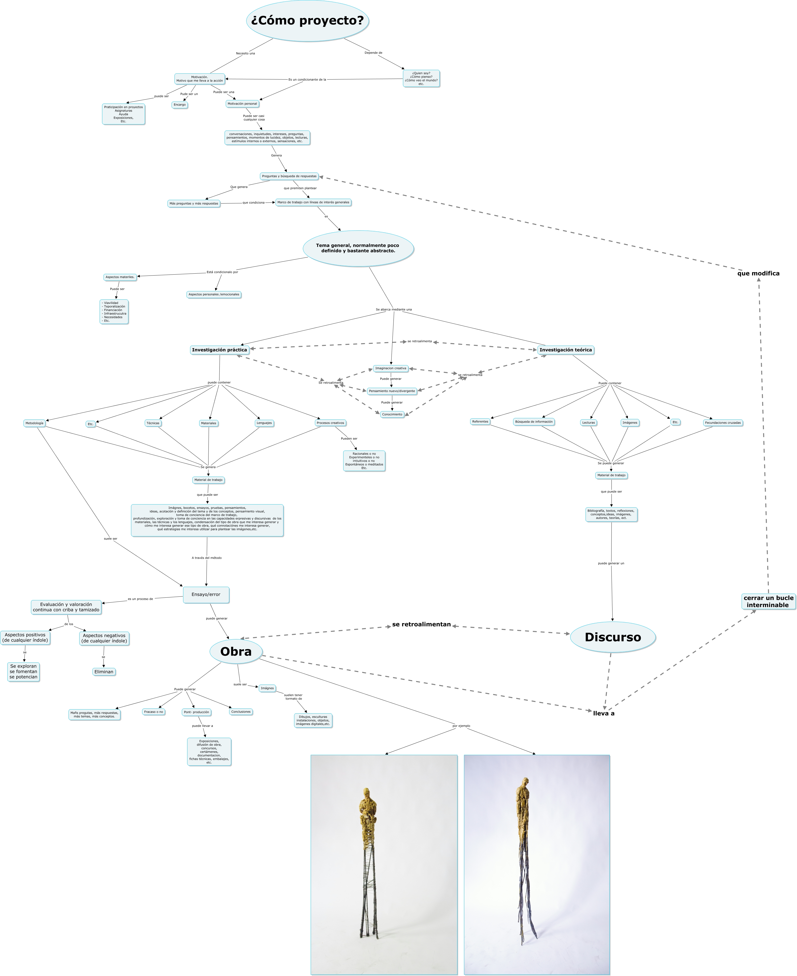 Este Cmap, tiene información relacionada con: Daniel Schweitzer, Investigación teórica Se abarca mediante una Investigación práctica, Pont- producción puede llevar a Exposiciones, difusión de obra, concursos, certámenes, documentacion, fichas técnicas, embalajes, etc., Imágnes suelen tener tormato de Dibujos, esculturas instalaciones, objetos, imágenes digitales,etc., Investigación práctica se retroalimenta Investigación teórica, Material de trabajo que puede ser Imágnes, bocetos, ensayos, pruebas, pensamientos, ideas, acotación y definición del tema y de los conceptos, pensamiento visual, toma de conciencia del marco de trabajo, profundización, exploración y toma de conciencia en las capacidades erpresivas y discursivas de los materiales, las técnicas y los lenguajes, condensación del tipo de obra que me interesa generar y cómo me interesa generar ese tipo de obra, qué connotaciónes me interesa generar, qué estrategias me interesa utilizar para plantear las imágenes,etc., Investigación práctica Se retroalimenta Pensamiento nuevo/divergente, Más preguntas y más respuestas que condiciona Marco de trabajo con líneas de interés generales, Discurso se retroalimentan Obra, ¿Cómo proyecto? Necesito una Motivación. Motivo que me lleva a la acción, Investigación práctica puede contener Etc., Lenguajes Se genera Material de trabajo, Investigación teórica se retroalimenta Conocimiento, Investigación práctica puede contener Materiales, Aspectos materiles. Puede ser - Viavilidad - Teporalización - Financiación - Infraestrucutra - Necesidades - Etc., Obra por ejemplo, Tema general, normalmente poco definido y bastante abstracto. Está condicionalo por Aspectos materiles., Motivación. Motivo que me lleva a la acción Puede ser una Motivación personal, Obra Puede generar Conclusiones, Obra Puede generar Mañs pregutas, más respuestas, más temas, más conceptos., Imaginacion creativa Puede generar Pensamiento nuevo/divergente