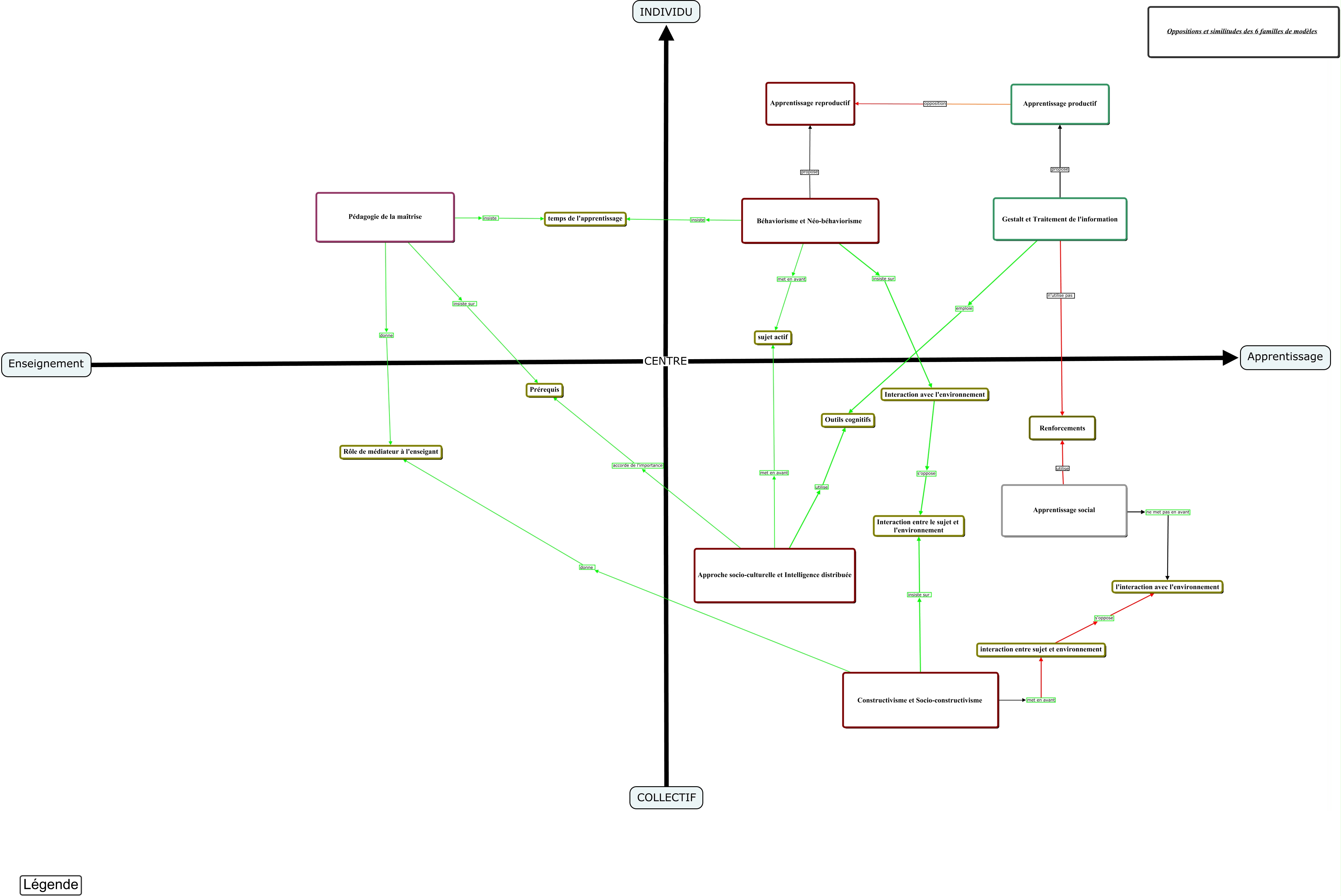 Cette carte de concepts créée avec IHMC CmapTools traite de: Sans titre, Apprentissage social ne met pas en avant l'interaction avec l'environnement, Interaction avec l'environnement s'oppose Interaction entre le sujet et l'environnement, Pédagogie de la maîtrise donne Rôle de médiateur à l'enseigant, Constructivisme et Socio-constructivisme donne Rôle de médiateur à l'enseigant, Approche socio-culturelle et Intelligence distribuée utilise Outils cognitifs, Apprentissage social utilise Renforcements, Gestalt et Traitement de l'information propose Apprentissage productif, Béhaviorisme et Néo-béhaviorisme insiste temps de l'apprentissage, Pédagogie de la maîtrise insiste temps de l'apprentissage, Béhaviorisme et Néo-béhaviorisme insiste sur Interaction avec l'environnement, Approche socio-culturelle et Intelligence distribuée met en avant sujet actif, Gestalt et Traitement de l'information emploie Outils cognitifs, Apprentissage productif opposition Apprentissage reproductif, interaction entre sujet et environnement s'oppose l'interaction avec l'environnement, Constructivisme et Socio-constructivisme met en avant interaction entre sujet et environnement, Constructivisme et Socio-constructivisme insiste sur Interaction entre le sujet et l'environnement, Béhaviorisme et Néo-béhaviorisme met en avant sujet actif, Pédagogie de la maîtrise insiste sur Prérequis, Approche socio-culturelle et Intelligence distribuée accorde de l'importance Prérequis, Gestalt et Traitement de l'information n'utilise pas Renforcements