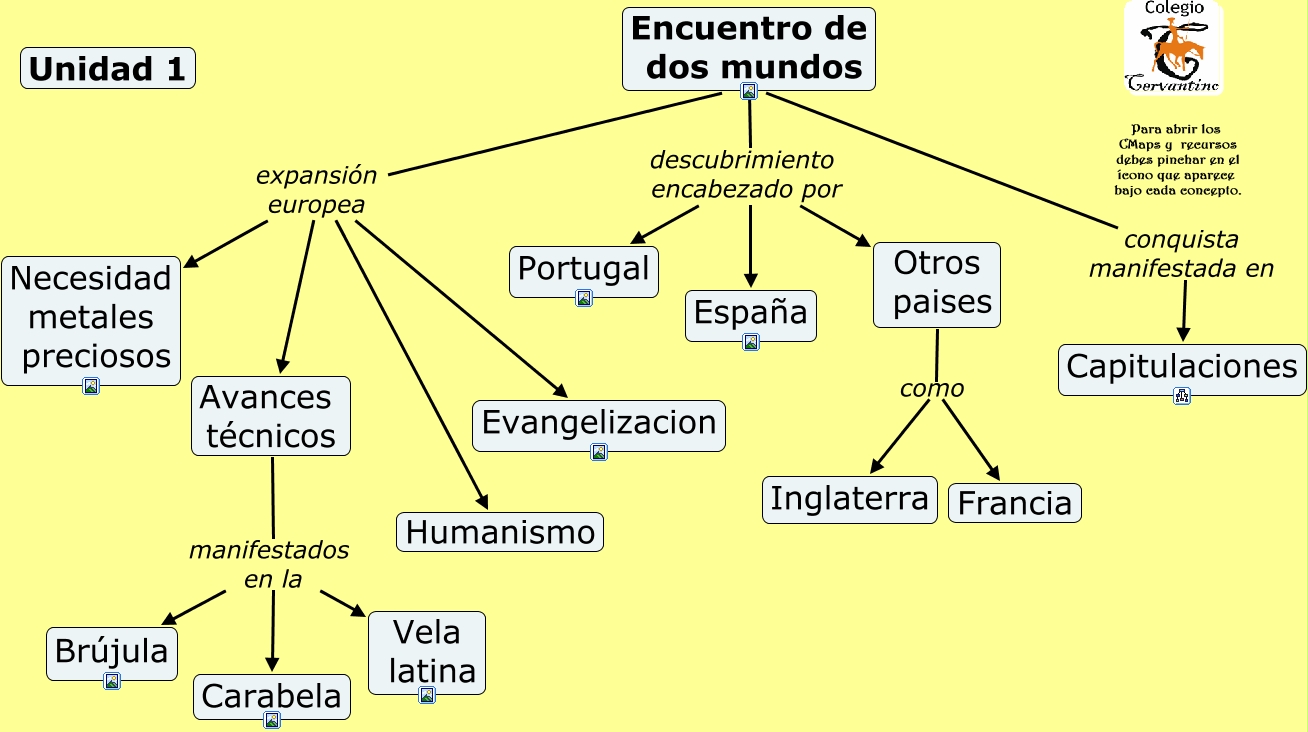 Este Cmap, tiene información relacionada con: Unidad 1. El encuentro entre dos mundos Europa y América, Avances técnicos manifestados en la Brújula, Encuentro de dos mundos descubrimiento encabezado por Otros paises, Encuentro de dos mundos conquista manifestada en Capitulaciones, Encuentro de dos mundos descubrimiento encabezado por España, Avances técnicos manifestados en la Vela latina, Encuentro de dos mundos expansión europea Humanismo, Otros paises como Inglaterra, Encuentro de dos mundos expansión europea Evangelizacion, Encuentro de dos mundos expansión europea Necesidad metales preciosos, Encuentro de dos mundos expansión europea Avances técnicos, Otros paises como Francia, Encuentro de dos mundos descubrimiento encabezado por Portugal, Avances técnicos manifestados en la Carabela