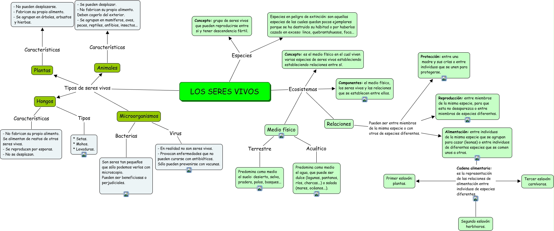 Este Cmap, tiene información relacionada con: Los seres vivos y sus ecosistemas, Medio físico Terrestre Predomina como medio el suelo: desierto, selva, pradera, polos, bosques..., LOS SERES VIVOS Ecosistemas Medio físico, Medio físico Acuático Predomina como medio el agua, que puede ser dulce (lagunas, pantanos, ríos, charcas...) o salada (mares, océanos...)., Alimentación: entre individuos de la misma especie que se agrupan para cazar (leonas) o entre individuos de diferentes especies que se comen unos a otros. Cadena alimentaria: es la representación de las relaciones de alimentación entre individuos de especies diferentes. Segundo eslavón: herbívoros., Microorganismos Bacterias Son seres tan pequeños que sólo podemos verlos con microscopio. Pueden ser beneficiosas o perjudiciales., Alimentación: entre individuos de la misma especie que se agrupan para cazar (leonas) o entre individuos de diferentes especies que se comen unos a otros. Cadena alimentaria: es la representación de las relaciones de alimentación entre individuos de especies diferentes. Primer eslavón: plantas., Plantas Características - No pueden desplazarse. - Fabrican su propio alimento. - Se agrupan en árboles, arbustos y hierbas., LOS SERES VIVOS Especies Especies en peligro de extinción: son aquellas especies de las cuales quedan pocos ejemplares porque se ha destruido su hábitad o por haberlos cazado en exceso: lince, quebrantahuesos, foca..., Animales Características - Se pueden desplazar. - No fabrican su propio alimento. Deben cogerlo del exterior. - Se agrupan en mamíferos, aves, peces, reptiles, anfibios, insectos..., Relaciones Pueden ser entre miembros de la misma especie o con otros de especies diferentes. Alimentación: entre individuos de la misma especie que se agrupan para cazar (leonas) o entre individuos de diferentes especies que se comen unos a otros., LOS SERES VIVOS Tipos de seres vivos Microorganismos, LOS SERES VIVOS Tipos de seres vivos Animales, Hongos Tipos * Setas. * Mohos. * Levaduras., LOS SERES VIVOS Ecosistemas Componentes: el medio físico, los seres vivos y las relaciones que se establecen entre ellos., LOS SERES VIVOS Tipos de seres vivos Plantas, LOS SERES VIVOS Tipos de seres vivos Hongos, Relaciones Pueden ser entre miembros de la misma especie o con otros de especies diferentes. Protección: entre una madre y sus crías o entre individuos que se unen para protegerse., LOS SERES VIVOS Ecosistemas Relaciones, Microorganismos Virus - En realidad no son seres vivos. - Provocan enfermedades que no pueden curarse con antibióticos. Sólo pueden prevenirse con vacunas., Alimentación: entre individuos de la misma especie que se agrupan para cazar (leonas) o entre individuos de diferentes especies que se comen unos a otros. Cadena alimentaria: es la representación de las relaciones de alimentación entre individuos de especies diferentes. Tercer eslavón: carnívoros.