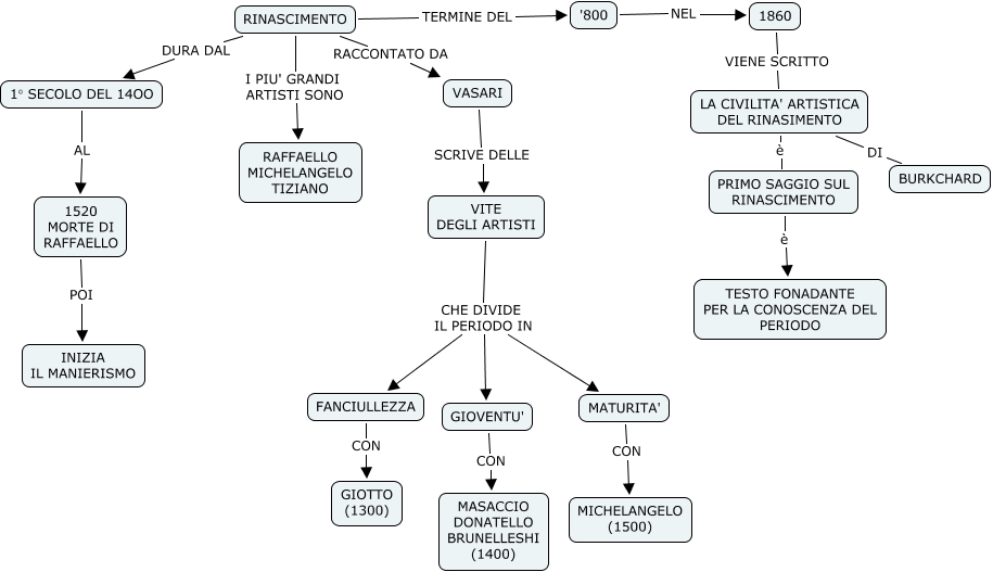 Questa Cmap, creata con IHMC CmapTools, contiene informazioni relative a: rinascimento intro, '800 NEL 1860, VASARI SCRIVE DELLE VITE DEGLI ARTISTI, FANCIULLEZZA CON GIOTTO (1300), RINASCIMENTO DURA DAL 1° SECOLO DEL 14OO, RINASCIMENTO I PIU' GRANDI ARTISTI SONO RAFFAELLO MICHELANGELO TIZIANO, 1860 VIENE SCRITTO LA CIVILITA' ARTISTICA DEL RINASIMENTO, RINASCIMENTO TERMINE DEL '800, VITE DEGLI ARTISTI CHE DIVIDE IL PERIODO IN MATURITA', PRIMO SAGGIO SUL RINASCIMENTO è TESTO FONADANTE PER LA CONOSCENZA DEL PERIODO, LA CIVILITA' ARTISTICA DEL RINASIMENTO è PRIMO SAGGIO SUL RINASCIMENTO, 1520 MORTE DI RAFFAELLO POI INIZIA IL MANIERISMO, VITE DEGLI ARTISTI CHE DIVIDE IL PERIODO IN FANCIULLEZZA, GIOVENTU' CON MASACCIO DONATELLO BRUNELLESHI (1400), 1° SECOLO DEL 14OO AL 1520 MORTE DI RAFFAELLO, LA CIVILITA' ARTISTICA DEL RINASIMENTO DI BURKCHARD, RINASCIMENTO RACCONTATO DA VASARI, MATURITA' CON MICHELANGELO (1500), VITE DEGLI ARTISTI CHE DIVIDE IL PERIODO IN GIOVENTU'