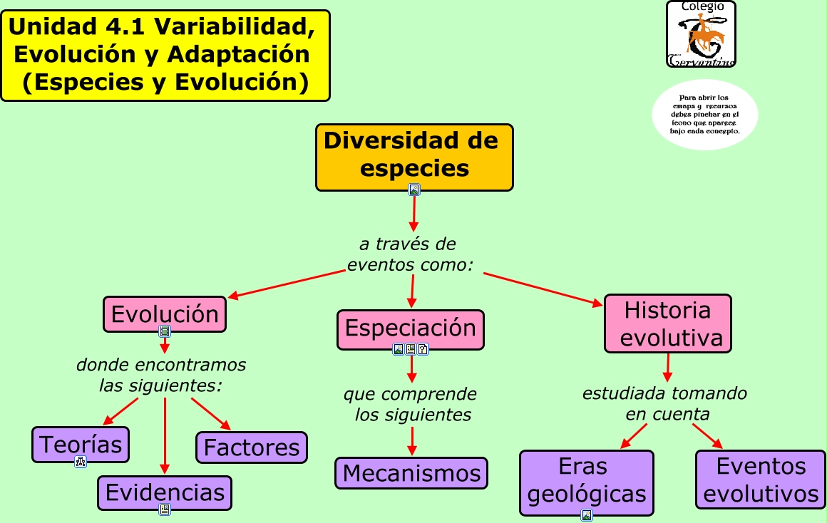 Este Cmap, tiene información relacionada con: 4.1 ESPECIES Y EVOLUCIÓN, Diversidad de especies a través de eventos como: Historia evolutiva, Diversidad de especies a través de eventos como: Especiación, Diversidad de especies a través de eventos como: Evolución, Historia evolutiva estudiada tomando en cuenta Eventos evolutivos, Evolución donde encontramos las siguientes: Evidencias, Historia evolutiva estudiada tomando en cuenta Eras geológicas, Evolución donde encontramos las siguientes: Teorías, Evolución donde encontramos las siguientes: Factores, Especiación que comprende los siguientes Mecanismos