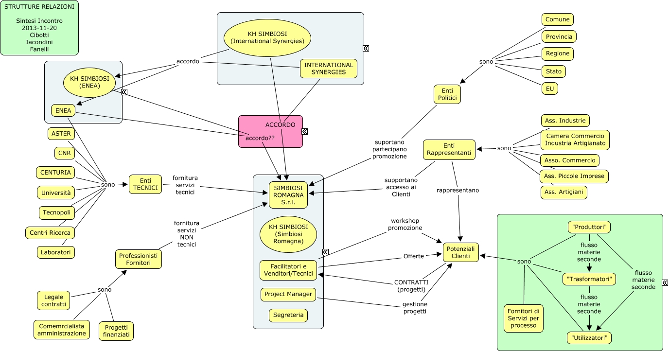 Questa Cmap, creata con IHMC CmapTools, contiene informazioni relative a: Strutture_Relazioni_2, Enti Rappresentanti suportano partecipano promozione SIMBIOSI ROMAGNA S.r.l., Tecnopoli sono Enti TECNICI, "Produttori" flusso materie seconde "Trasformatori", "Produttori" sono Potenziali Clienti, Laboratori sono Enti TECNICI, CNR sono Enti TECNICI, Università sono Enti TECNICI, KH SIMBIOSI (ENEA) accordo?? SIMBIOSI ROMAGNA S.r.l., Regione sono Enti Politici, Facilitatori e Venditori/Tecnici workshop promozione Potenziali Clienti, "Trasformatori" sono Potenziali Clienti, "Utilizzatori" sono Potenziali Clienti, KH SIMBIOSI (International Synergies) accordo KH SIMBIOSI (ENEA), Asso. Commercio sono Enti Rappresentanti, "Produttori" flusso materie seconde "Utilizzatori", Comune sono Enti Politici, Project Manager gestione progetti Potenziali Clienti, Progetti finanziati sono Professionisti Fornitori, Legale contratti sono Professionisti Fornitori, Ass. Piccole Imprese sono Enti Rappresentanti