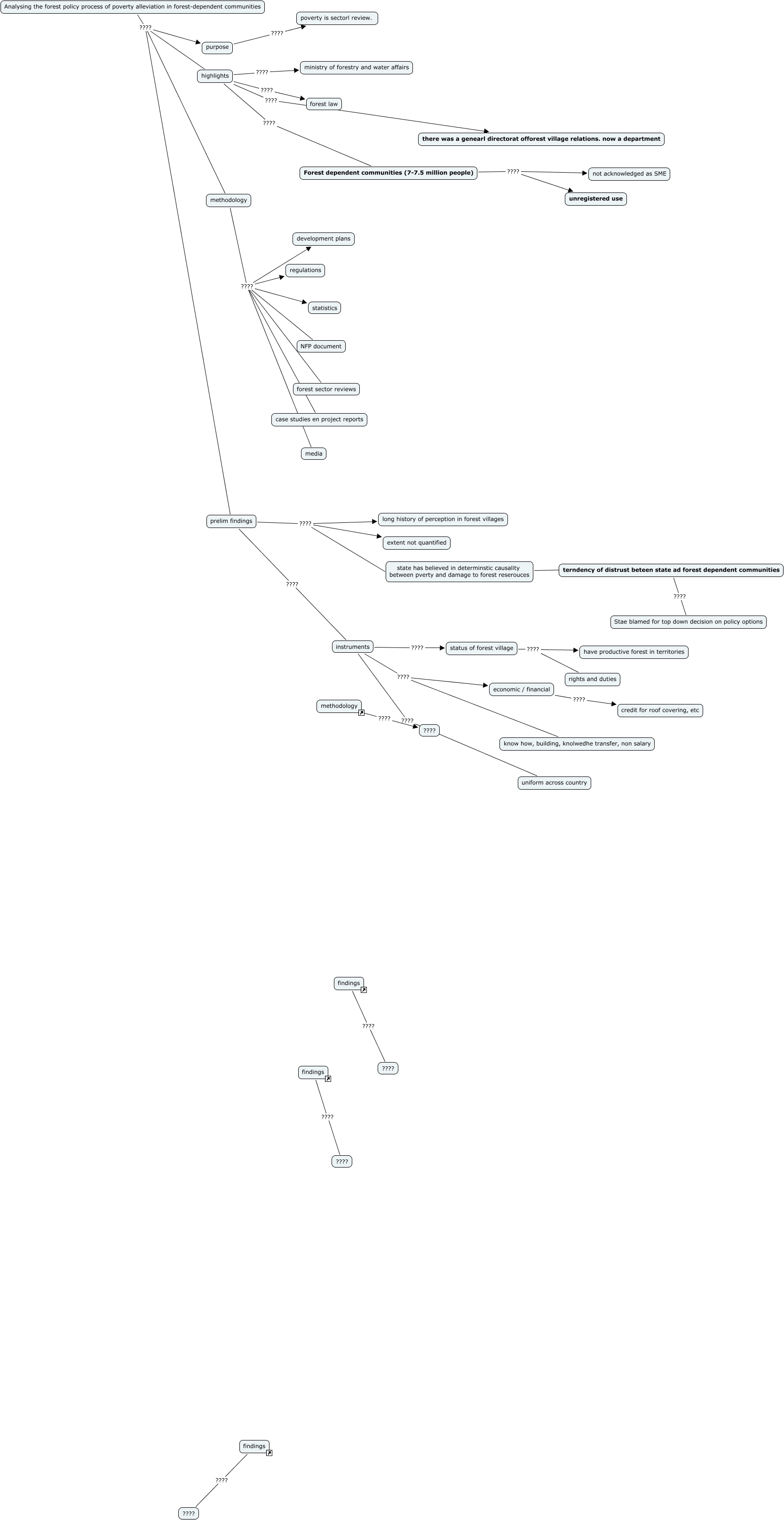 This Concept Map, created with IHMC CmapTools, has information related to: Idris Durusoy et al presented by Bekir Kayacan Analysing the forest policy process of poverty alleviation in forest-dependent communities the Turkish case, methodology ???? NFP document, methodology ???? ????, purpose ???? poverty is sectorl review., Analysing the forest policy process of poverty alleviation in forest-dependent communities ???? highlights, highlights ???? ministry of forestry and water affairs, findings ???? ????, methodology ???? media, state has believed in determinstic causality between pverty and damage to forest reserouces ???? terndency of distrust beteen state ad forest dependent communities, Forest dependent communities (7-7.5 million people) ???? not acknowledged as SME, instruments ???? uniform across country, Analysing the forest policy process of poverty alleviation in forest-dependent communities ???? methodology, methodology ???? development plans, findings ???? ????, instruments ???? economic / financial, methodology ???? regulations, methodology ???? case studies en project reports, Analysing the forest policy process of poverty alleviation in forest-dependent communities ???? purpose, highlights ???? Forest dependent communities (7-7.5 million people), highlights ???? there was a genearl directorat offorest village relations. now a department, instruments ???? status of forest village
