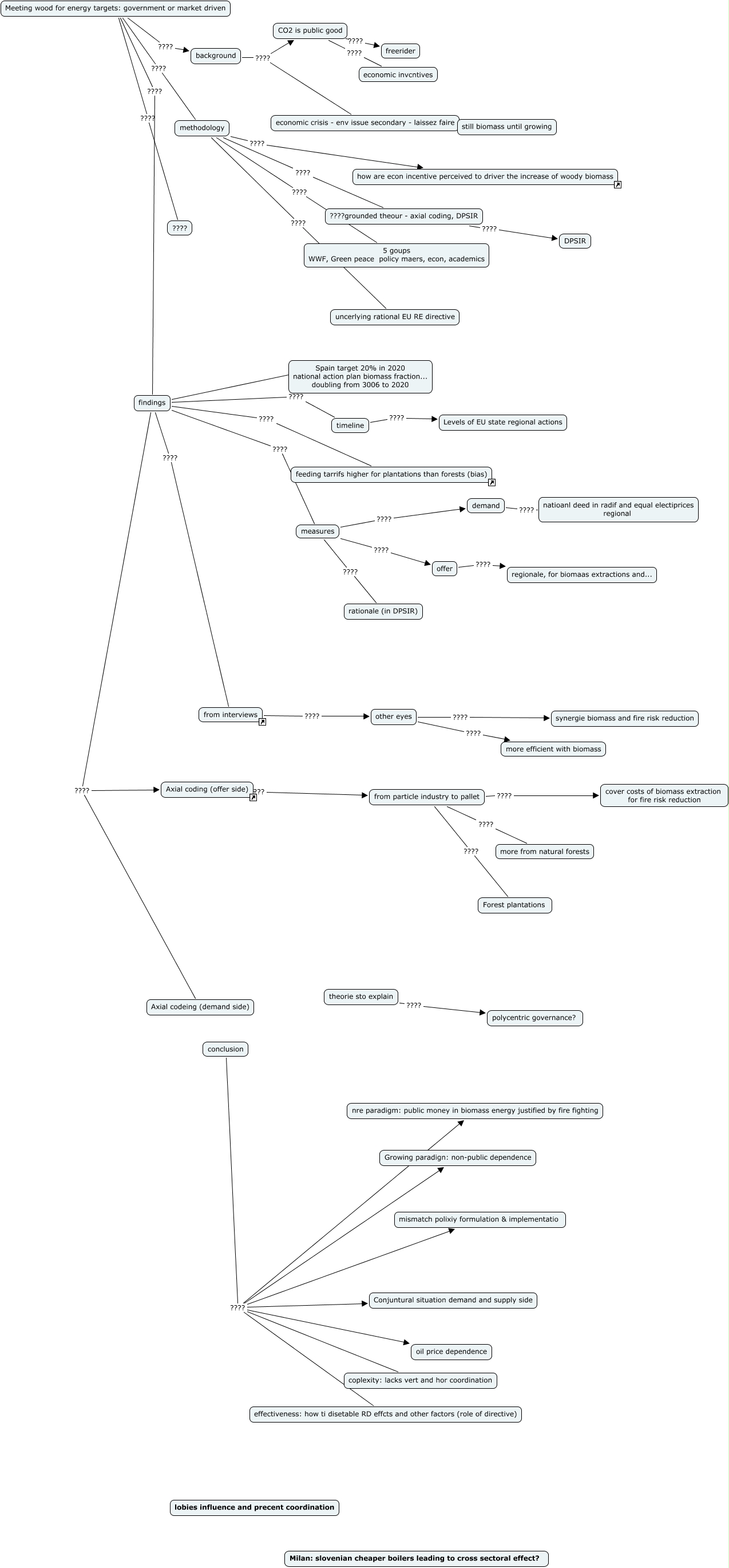 This Concept Map, created with IHMC CmapTools, has information related to: Elena Górriz Meeting wood for energy targets - government or market driven, methodology ???? ????grounded theour - axial coding, DPSIR, findings ???? measures, measures ???? demand, Meeting wood for energy targets: government or market driven ???? findings, other eyes ???? synergie biomass and fire risk reduction, from particle industry to pallet ???? Forest plantations, from interviews ???? other eyes, Axial coding (offer side) ???? from particle industry to pallet, measures ???? rationale (in DPSIR), methodology ???? 5 goups WWF, Green peace policy maers, econ, academics, demand ???? natioanl deed in radif and equal electiprices regional, Meeting wood for energy targets: government or market driven ???? methodology, Meeting wood for energy targets: government or market driven ???? ????, ????grounded theour - axial coding, DPSIR ???? DPSIR, findings ???? feeding tarrifs higher for plantations than forests (bias), conclusion ???? effectiveness: how ti disetable RD effcts and other factors (role of directive), from particle industry to pallet ???? more from natural forests, methodology ???? uncerlying rational EU RE directive, measures ???? offer, CO2 is public good ???? economic invcntives