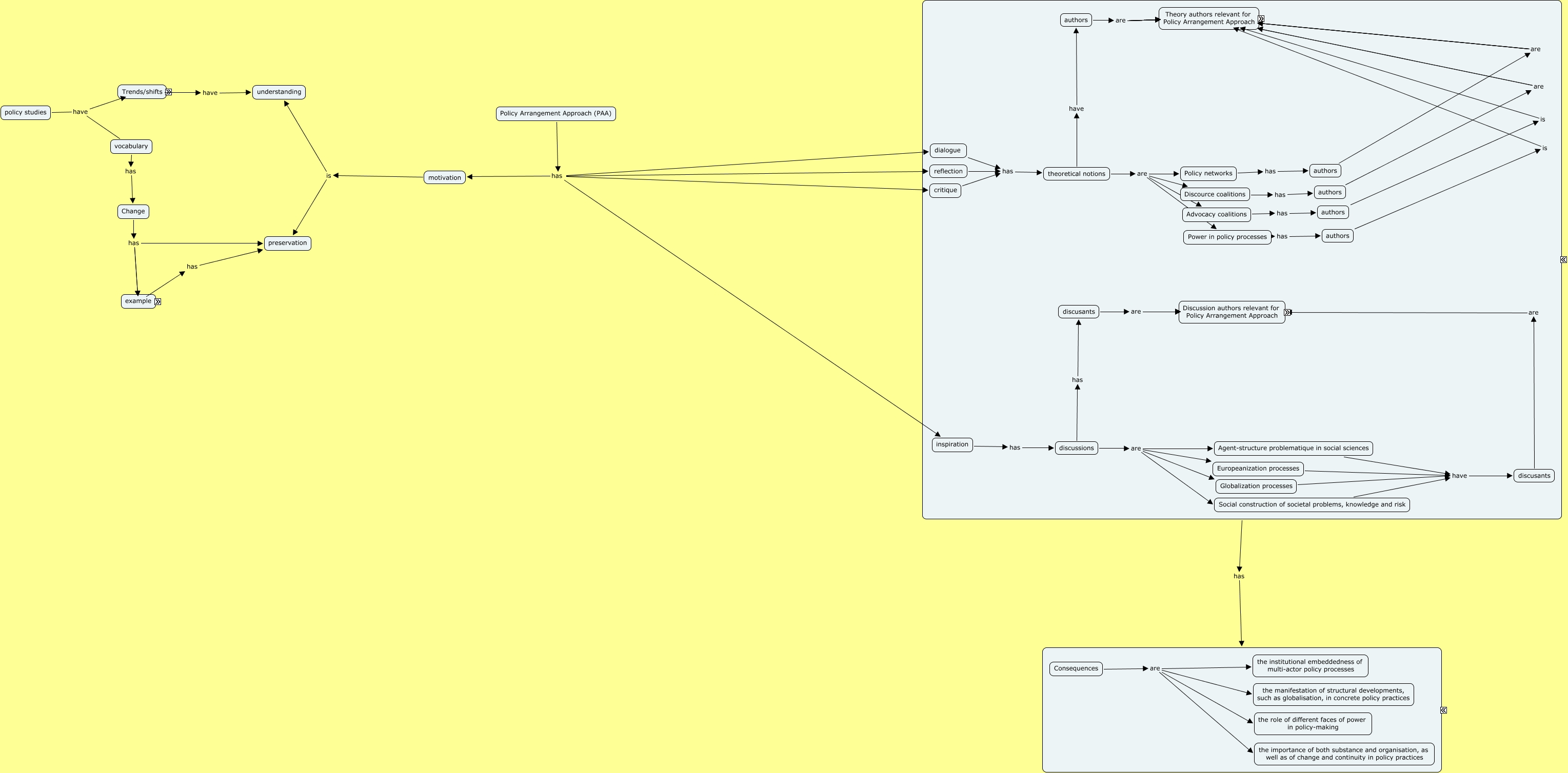 This Concept Map, created with IHMC CmapTools, has information related to: Arts 2004 Policy and power - A conceptual framework between the old and new policy idioms, Policy Arrangement Approach (PAA) has inspiration, discusants are Knill, Discource coalitions has authors, Consequences are the role of different faces of power in policy-making, governance is governance theory not consdering power, power is not Rational choice, Social construction of societal problems, knowledge and risk have discusants, Advocacy coalitions has authors, Change has new concepts, new concepts are interdepence, authors is Goverde, Consequences are the manifestation of structural developments, such as globalisation, in concrete policy practices, Policy Arrangement Approach (PAA) has motivation, Consequences are the importance of both substance and organisation, as well as of change and continuity in policy practices, trends/shifts are real transformation, trends/shifts are myths (LB), new concepts are Institutional capacity, policy studies have vocabulary, authors are Sabatier, authors are Hayer