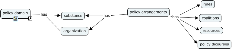 This Concept Map, created with IHMC CmapTools, has information related to: Concept Policy Domain and Policy Arrangement by Arts 2006 Political modernisation and policy arrangements - PAA, policy arrangements has policy dicourses, policy arrangements has resources, policy arrangements has organization, policy arrangements has substance, policy domain has substance, policy arrangements has coalitions, policy arrangements has rules, policy domain has organization