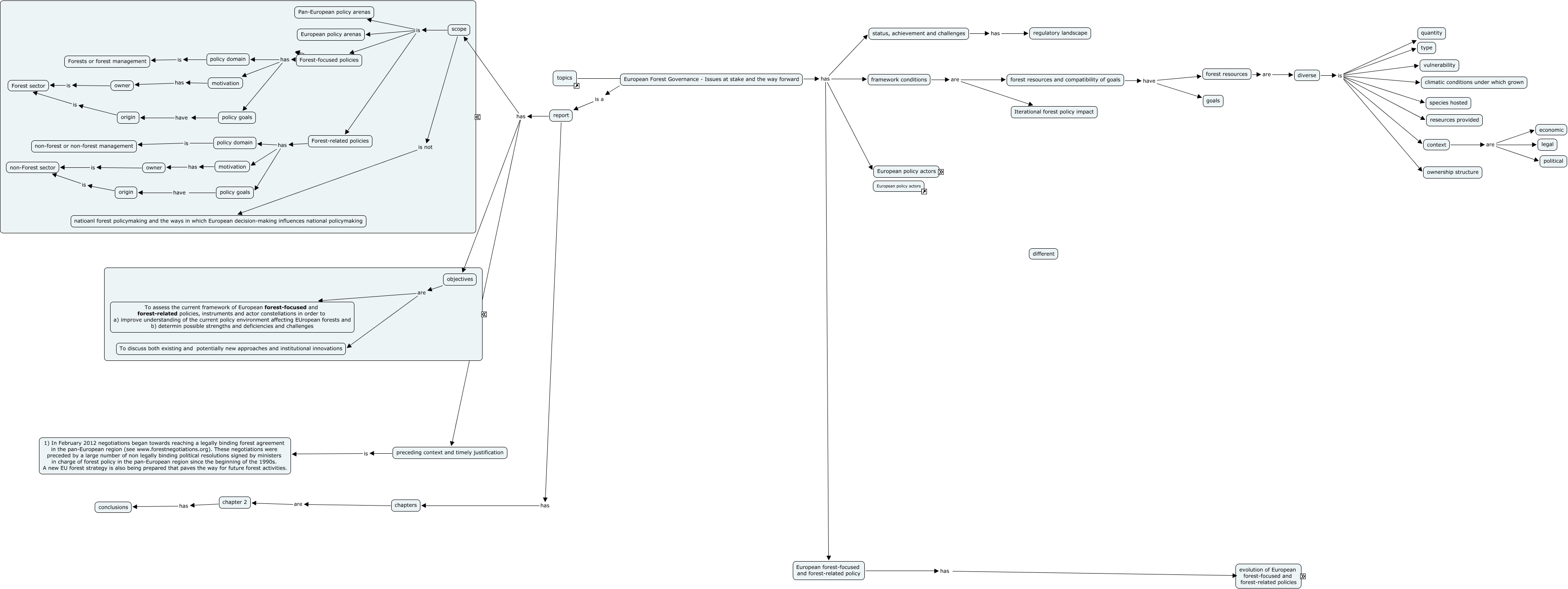 This Concept Map, created with IHMC CmapTools, has information related to: Pulzl 2013 European Forest Governance - Issues at stake and the way forward, European policy actors have voiced concerns, diverse is type, report has chapters, Forest-focused policies has policy domain, evolution is end of the 1990s, an EU forestry strategy backed up by a Council Resolution helped to establish an action framework, evolution is mid-2000 it became evident that coherence and coordination in forest policy-making was still lacking, objectives are To discuss both existing and potentially new approaches and institutional innovations, origin is non-Forest sector, evolution is The EC treaties of 1957 did not make specific provisions for forests and/or forestry., European forest-focused and forest-related policy has evolution, report has objectives, policy domain is Forests or forest management, scope is European policy arenas, objectives are To assess the current framework of European forest-focused and forest-related policies, instruments and actor constellations in order to a) improve understanding of the current policy environment affecting EUropean forests and b) determin possible strengths and deficiencies and challenges, different problems are employees in the Commission the main policy problem is the lack of a clear EU treaty base, different problems are Member states often claim to suffer from institutional fragmentation and a lack of visibility, motivation has owner, European Forest Governance - Issues at stake and the way forward has European forest-focused and forest-related policy, diverse is ownership structure, diverse is reseurces provided