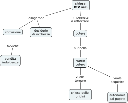 Questa Cmap, creata con IHMC CmapTools, contiene informazioni relative a: cap_1-lutero_parte-1, corruzione avviene vendita indulgenze, chiesa XIV sec. impegnata a rafforzare potere, Martin Lutero vuole acquisire autonomia dal papato, potere si ribella Martin Lutero, chiesa XIV sec. dilagarono desiderio di ricchezza, Martin Lutero vuole tornare chiesa delle origini, chiesa XIV sec. dilagarono corruzione