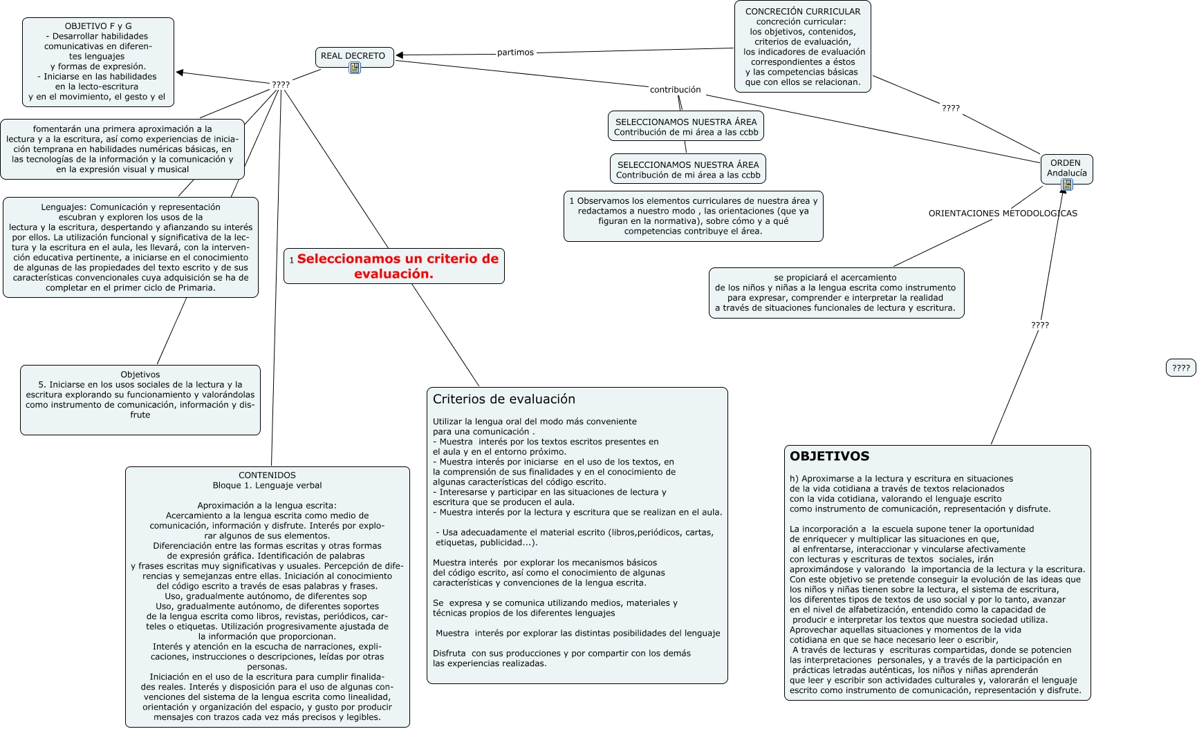 Este Cmap, tiene información relacionada con: Concreción Curricular, REAL DECRETO contribución SELECCIONAMOS NUESTRA ÁREA Contribución de mi área a las ccbb, ORDEN Andalucía ORIENTACIONES METODOLOGICAS se propiciará el acercamiento de los niños y niñas a la lengua escrita como instrumento para expresar, comprender e interpretar la realidad a través de situaciones funcionales de lectura y escritura., REAL DECRETO contribución SELECCIONAMOS NUESTRA ÁREA Contribución de mi área a las ccbb, CONCRECIÓN CURRICULAR concreción curricular: los objetivos, contenidos, criterios de evaluación, los indicadores de evaluación correspondientes a éstos y las competencias básicas que con ellos se relacionan. ???? ORDEN Andalucía, REAL DECRETO ???? Lenguajes: Comunicación y representación escubran y exploren los usos de la lectura y la escritura, despertando y afianzando su interés por ellos. La utilización funcional y significativa de la lec- tura y la escritura en el aula, les llevará, con la interven- ción educativa pertinente, a iniciarse en el conocimiento de algunas de las propiedades del texto escrito y de sus características convencionales cuya adquisición se ha de completar en el primer ciclo de Primaria., ORDEN Andalucía contribución SELECCIONAMOS NUESTRA ÁREA Contribución de mi área a las ccbb, ORDEN Andalucía contribución SELECCIONAMOS NUESTRA ÁREA Contribución de mi área a las ccbb, CONCRECIÓN CURRICULAR concreción curricular: los objetivos, contenidos, criterios de evaluación, los indicadores de evaluación correspondientes a éstos y las competencias básicas que con ellos se relacionan. partimos REAL DECRETO, OBJETIVOS h) Aproximarse a la lectura y escritura en situaciones de la vida cotidiana a través de textos relacionados con la vida cotidiana, valorando el lenguaje escrito como instrumento de comunicación, representación y disfrute. La incorporación a la escuela supone tener la oportunidad de enriquecer y multiplicar las situaciones en que, al enfrentarse, interaccionar y vincularse afectivamente con lecturas y escrituras de textos sociales, irán aproximándose y valorando la importancia de la lectura y la escritura. Con este objetivo se pretende conseguir la evolución de las ideas que los niños y niñas tienen sobre la lectura, el sistema de escritura, los diferentes tipos de textos de uso social y por lo tanto, avanzar en el nivel de alfabetización, entendido como la capacidad de producir e interpretar los textos que nuestra sociedad utiliza. Aprovechar aquellas situaciones y momentos de la vida cotidiana en que se hace necesario leer o escribir, A través de lecturas y escrituras compartidas, donde se potencien las interpretaciones personales, y a través de la participación en prácticas letradas auténticas, los niños y niñas aprenderán que leer y escribir son actividades culturales y, valorarán el lenguaje escrito como instrumento de comunicación, representación y disfrute. ???? ORDEN Andalucía, REAL DECRETO ???? Criterios de evaluación Utilizar la lengua oral del modo más conveniente para una comunicación . - Muestra interés por los textos escritos presentes en el aula y en el entorno próximo. - Muestra interés por iniciarse en el uso de los textos, en la comprensión de sus finalidades y en el conocimiento de algunas características del código escrito. - Interesarse y participar en las situaciones de lectura y escritura que se producen el aula. - Muestra interés por la lectura y escritura que se realizan en el aula. - Usa adecuadamente el material escrito (libros,periódicos, cartas, etiquetas, publicidad...). Muestra interés por explorar los mecanismos básicos del código escrito, así como el conocimiento de algunas características y convenciones de la lengua escrita. Se expresa y se comunica utilizando medios, materiales y técnicas propios de los diferentes lenguajes Muestra interés por explorar las distintas posibilidades del lenguaje Disfruta con sus producciones y por compartir con los demás las experiencias realizadas., REAL DECRETO ???? OBJETIVO F y G - Desarrollar habilidades comunicativas en diferen- tes lenguajes y formas de expresión. - Iniciarse en las habilidades en la lecto-escritura y en el movimiento, el gesto y el, REAL DECRETO ???? fomentarán una primera aproximación a la lectura y a la escritura, así como experiencias de inicia- ción temprana en habilidades numéricas básicas, en las tecnologías de la información y la comunicación y en la expresión visual y musical, REAL DECRETO ???? Objetivos 5. Iniciarse en los usos sociales de la lectura y la escritura explorando su funcionamiento y valorándolas como instrumento de comunicación, información y dis- frute, REAL DECRETO ???? CONTENIDOS Bloque 1. Lenguaje verbal Aproximación a la lengua escrita: Acercamiento a la lengua escrita como medio de comunicación, información y disfrute. Interés por explo- rar algunos de sus elementos. Diferenciación entre las formas escritas y otras formas de expresión gráfica. Identificación de palabras y frases escritas muy significativas y usuales. Percepción de dife- rencias y semejanzas entre ellas. Iniciación al conocimiento del código escrito a través de esas palabras y frases. Uso, gradualmente autónomo, de diferentes sop Uso, gradualmente autónomo, de diferentes soportes de la lengua escrita como libros, revistas, periódicos, car- teles o etiquetas. Utilización progresivamente ajustada de la información que proporcionan. Interés y atención en la escucha de narraciones, expli- caciones, instrucciones o descripciones, leídas por otras personas. Iniciación en el uso de la escritura para cumplir finalida- des reales. Interés y disposición para el uso de algunas con- venciones del sistema de la lengua escrita como linealidad, orientación y organización del espacio, y gusto por producir mensajes con trazos cada vez más precisos y legibles.