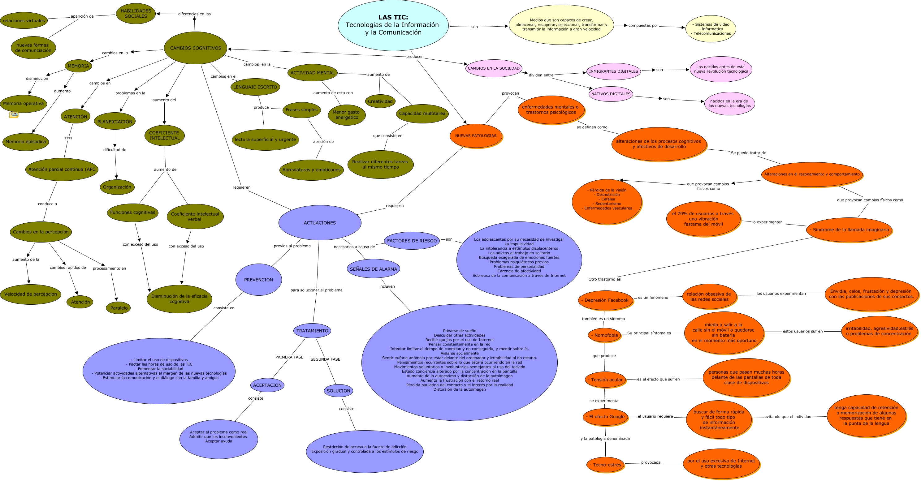 Este Cmap, tiene información relacionada con: Las TIC, SOLUCION consiste Restricción de acceso a la fuente de adicción Exposición gradual y controlada a los estímulos de riesgo, LENGUAJE ESCRITO produce lectura superficial y urgente, ACEPTACION consiste Aceptar el problema como real Admitir que los inconvenientes Aceptar ayuda, CAMBIOS COGNITIVOS requieren ACTUACIONES, Cambios en la percepción cambios rapidos de Atención, MEMORIA disminución Memoria operativa, - Depresión Facebook también es un síntoma - Nomofobia, ACTIVIDAD MENTAL aumento de Capacidad multitarea, COEFICIENTE INTELECTUAL aumento de Coeficiente intelectual verbal, CAMBIOS COGNITIVOS cambios en ATENCIÓN, Cambios en la percepción procesamiento en Paralelo, - Síndrome de la llamada imaginaria lo experimentan el 70% de usuarios a través una vibración fastama del móvil, ACTUACIONES previas al problema PREVENCION, - Tecno-estrés provocada por el uso excesivo de Internet y otras tecnologías, - Depresión Facebook es un fenómeno relación obsesiva de las redes sociales, Alteraciones en el razonamiento y comportamiento que provocan cambios físicos como - Síndrome de la llamada imaginaria, Medios que son capaces de crear, almacenar, recuperar, seleccionar, transformar y transmitir la información a gran velocidad compuestas por - Sistemas de video - Informatica - Telecomunicaciones, relación obsesiva de las redes sociales los usuarios experimentan Envidia, celos, frustación y depresión con las publicaciones de sus contactos., Alteraciones en el razonamiento y comportamiento Se puede tratar de alteraciones de los procesos cognitivos y afectivos de desarrollo, miedo a salir a la calle sin el móvil o quedarse sin batería en el momento más oportuno estos usuarios sufren irritabilidad, agresividad,estrés o problemas de concentración