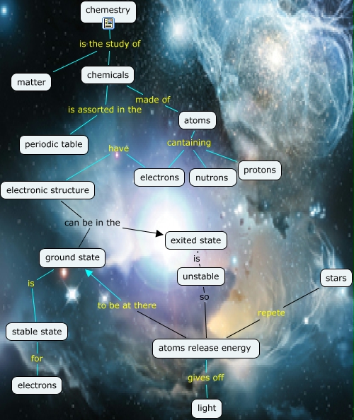 This Concept Map, created with IHMC CmapTools, has information related to: cosmic eveloution and chemestry, atoms cantaining electrons, atoms release energy gives off light, atoms cantaining protons, electronic structure can be in the ground state, atoms release energy to be at there ground state, chemestry is the study of chemicals, exited state is unstable, chemestry is the study of matter, chemicals is assorted in the periodic table, atoms cantaining nutrons, stars repete atoms release energy, electronic structure can be in the exited state, chemicals made of atoms, stable state for electrons, ground state is stable state, unstable so atoms release energy, electrons have electronic structure