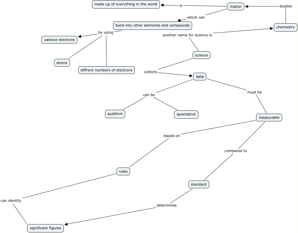 This Concept Map, created with IHMC CmapTools, has information related to: science, bond into other elements and compounds by using atoms, science another name for science is chemestry, bond into other elements and compounds by using valence electrons, bond into other elements and compounds by using diffrent numbers of electrons, matter which can bond into other elements and compounds, rules can identify significant figures, data must be measurable, measurable compared to standard, data can be quantative, standard determines significant figures, chemestry studies matter, matter is made up of everything in the world, data can be qualitive, science collects data, measurable based on rules
