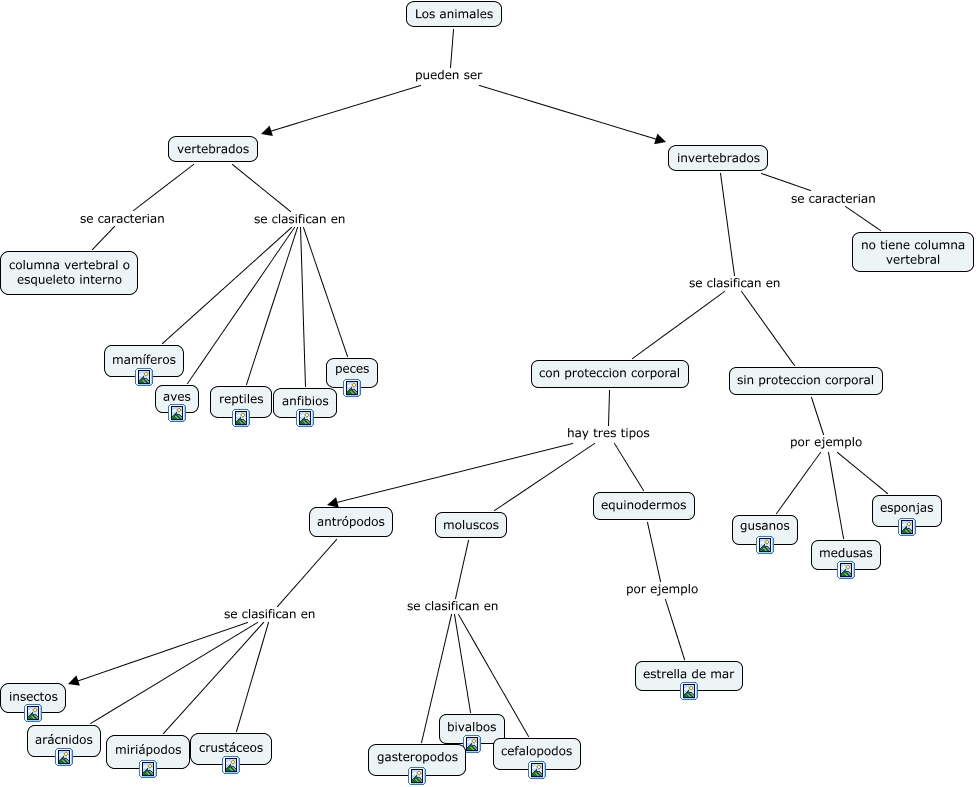 Este Cmap, tiene información relacionada con: los animales, antrópodos se clasifican en crustáceos, moluscos se clasifican en cefalopodos, antrópodos se clasifican en insectos, Los animales pueden ser vertebrados, con proteccion corporal hay tres tipos equinodermos, con proteccion corporal hay tres tipos antrópodos, invertebrados se clasifican en con proteccion corporal, sin proteccion corporal por ejemplo gusanos, equinodermos por ejemplo estrella de mar, invertebrados se caracterian no tiene columna vertebral, sin proteccion corporal por ejemplo medusas, moluscos se clasifican en bivalbos, vertebrados se clasifican en mamíferos, vertebrados se clasifican en anfibios, vertebrados se clasifican en reptiles, antrópodos se clasifican en arácnidos, vertebrados se caracterian columna vertebral o esqueleto interno, con proteccion corporal hay tres tipos moluscos, antrópodos se clasifican en miriápodos, Los animales pueden ser invertebrados