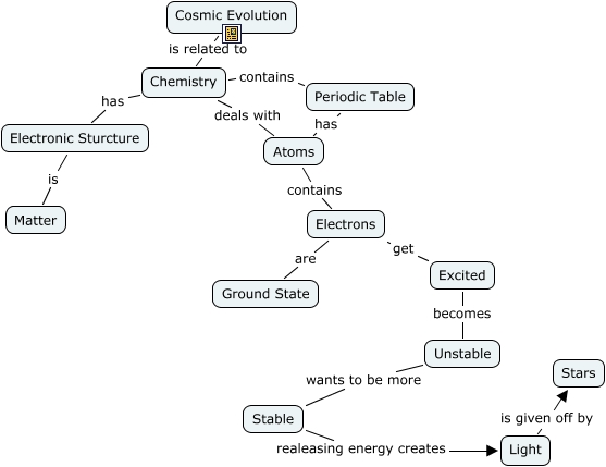 This Concept Map, created with IHMC CmapTools, has information related to: Cosmic, Periodic Table has Atoms, Electronic Sturcture is Matter, Unstable wants to be more Stable, Chemistry has Electronic Sturcture, Chemistry deals with Atoms, Cosmic Evolution is related to Chemistry, Electrons are Ground State, Chemistry contains Periodic Table, Stable realeasing energy creates Light, Excited becomes Unstable, Light is given off by Stars, Atoms contains Electrons, Electrons get Excited