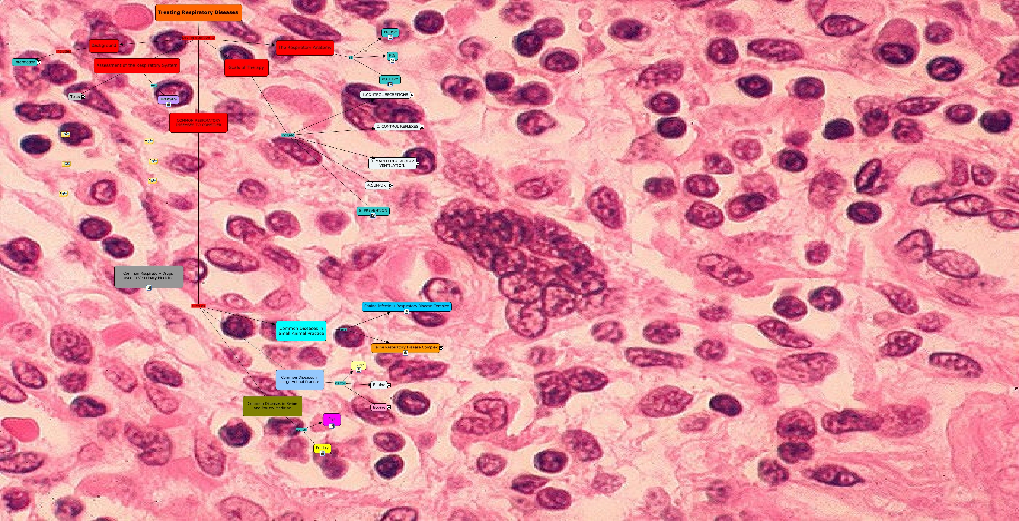 This Concept Map, created with IHMC CmapTools, has information related to: Respiratory redrafted, Treating Respiratory Diseases paying atention to Assessment of the Respiratory System, Methylxanthines include Theophylline; Standard preps:10mg/kg q6-8h PO, Sustained Released Preps: 20 mg/kg q12h, Opiods include Dihydrocodeine tartrate; Starting dose: 2mg/kg q8-12h PO, a.Non- productive Coughing include II. Peripherally acting Antitussive, Goals of Therapy include 2. Control Reflexes, BRD ... Treatment and Prevention, Common Diseases in Small Animal Practice are Canine Infectious Respiratory Disease Complex, 2. Control Reflexes are b. Sneezing, The Respiratory Anatomy of POULTRY, I. Treating the Specific Cause using Antimicrobials (infection), BRD in Beef cattle, I. Bronchodilators using Methylxanthines, 4. Support by II. Lowering stress in shelters, a. Increasing Elimination using Nebulization, Treating Respiratory Diseases paying atention to Background, Diagnostic Procedure comprising of Nuclear imaging:lung scans, 1. Control Secretions by b. Decreasing production by treating the specific diseease process, 2. Control Reflexes are a.Non- productive Coughing, Common Diseases in Swine and Poultry Medicine as for Poultry, Bovine includes Other