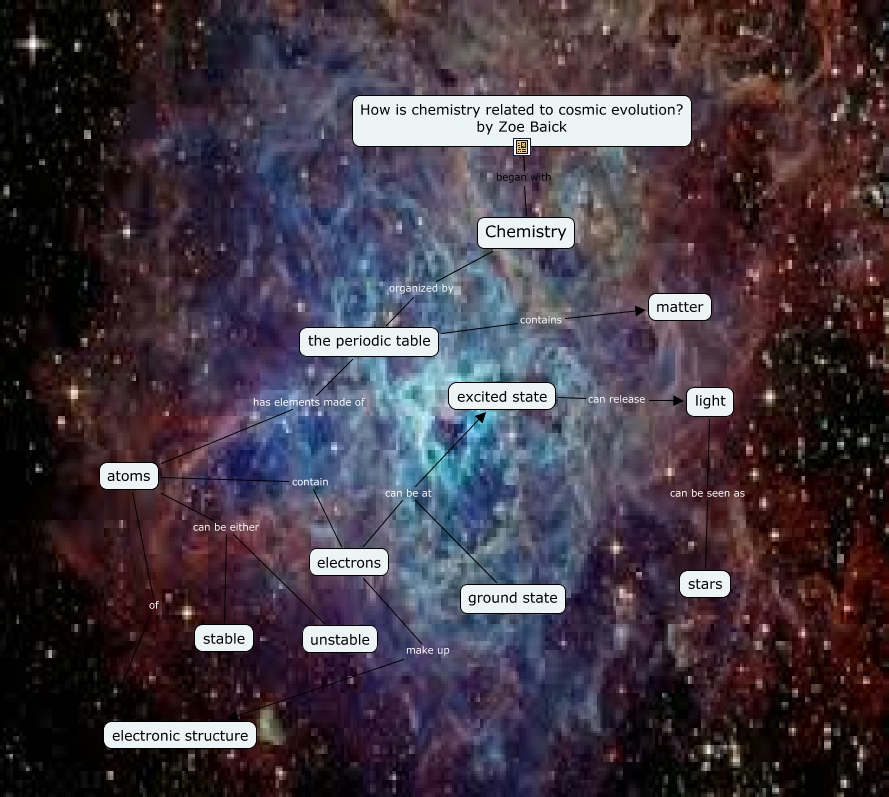 This Concept Map, created with IHMC CmapTools, has information related to: Chemistry to Cosmic Evolution, atoms can be either unstable, atoms contain electrons, Chemistry organized by the periodic table, electrons can be at ground state, atoms of electronic structure, the periodic table contains matter, electrons can be at excited state, light can be seen as stars, excited state can release light, atoms can be either stable, the periodic table has elements made of atoms, electrons make up electronic structure, How is chemistry related to cosmic evolution? by Zoe Baick began with Chemistry