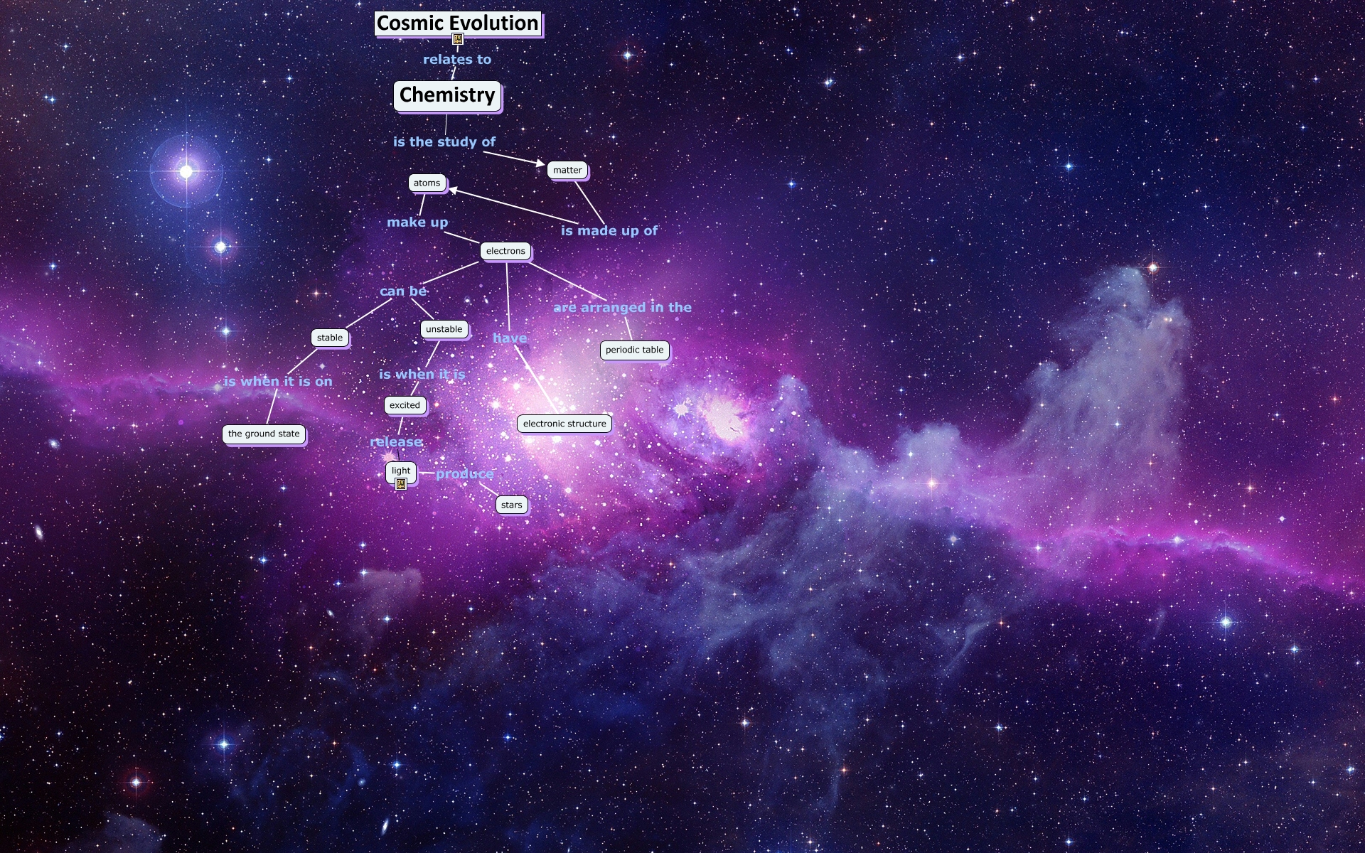 This Concept Map, created with IHMC CmapTools, has information related to: Chemistry to Cosmic Evolution, electrons can be unstable, electrons can be stable, electrons have electronic structure, Cosmic Evolution relates to Chemistry, Chemistry is the study of matter, stable is when it is on the ground state, matter is made up of atoms, atoms make up electrons, unstable is when it is excited, electrons are arranged in the periodic table, light produce stars, excited release light