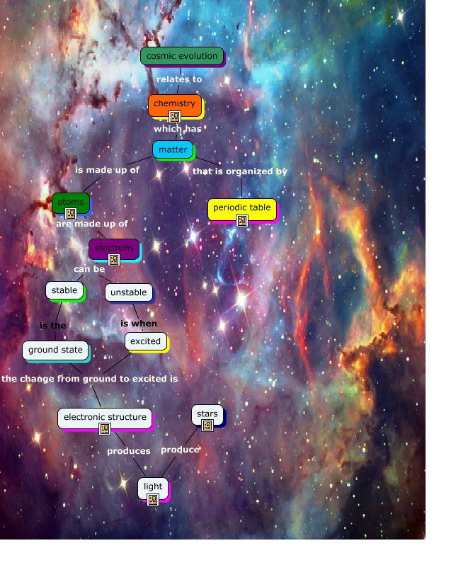 This Concept Map, created with IHMC CmapTools, has information related to: Chemistry to Cosmic Evolution, matter that is organized by periodic table, ground state the change from ground to excited is electronic structure, cosmic evolution relates to chemistry, electrons can be unstable, electronic structure produces light, atoms are made up of electrons, stable is the ground state, matter is made up of atoms, chemistry which has matter, excited the change from ground to excited is electronic structure, electrons can be stable, stars produce light, unstable is when excited