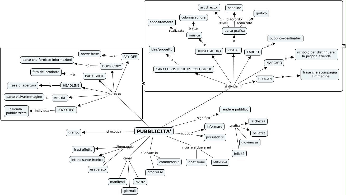Questa Cmap, creata con IHMC CmapTools, contiene informazioni relative a: pubblicità, PUBBLICITA' si divide in progresso, PUBBLICITA' diviso in PACK SHOT, PUBBLICITA' canali giornali, informare grafica giovinezza, PUBBLICITA' si divide in MARCHIO, musica realizzata appositamente, SLOGAN è frase che acompagna l'immagine, PACK SHOT è foto del prodotto, PUBBLICITA' diviso in BODY COPY, BODY COPY è parte che fornisce informazioni, PUBBLICITA' ricorre a due armi ripetizione, PUBBLICITA' canali riviste, PAY OFF è breve frase, VISUAL è parte grafica, PUBBLICITA' si divide in VISUAL, LOGOTIPO individua azienda pubblicizzata, parte grafica realizzata grafico, PUBBLICITA' linguaggio frasi effetto, informare grafica felicità, PUBBLICITA' diviso in LOGOTIPO