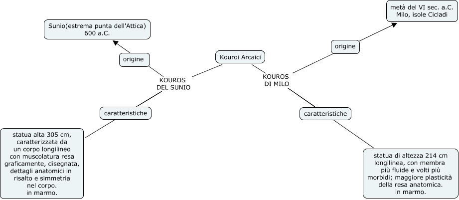 Questa Cmap, creata con IHMC CmapTools, contiene informazioni relative a: Kouroi Arcaici, Kouroi Arcaici KOUROS DEL SUNIO statua alta 305 cm, caratterizzata da un corpo longilineo con muscolatura resa graficamente, disegnata, dettagli anatomici in risalto e simmetria nel corpo. in marmo., Kouroi Arcaici KOUROS DI MILO metà del VI sec. a.C. Milo, isole Cicladi, Kouroi Arcaici KOUROS DI MILO caratteristiche, Kouroi Arcaici KOUROS DI MILO statua di altezza 214 cm longilinea, con membra più fluide e volti più morbidi; maggiore plasticità della resa anatomica. in marmo., Kouroi Arcaici KOUROS DEL SUNIO Sunio(estrema punta dell'Attica) 600 a.C., Kouroi Arcaici KOUROS DEL SUNIO caratteristiche