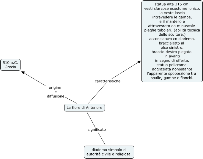 Questa Cmap, creata con IHMC CmapTools, contiene informazioni relative a: kore di antenore, La Kore di Antenore caratteristiche statua alta 215 cm. vesti sfarzose ecostume ionico. la veste lascia intravedere le gambe, e il mantello è attravesrato da minuscole pieghe tubolari. (abilità tecnica dello scultore.) acconciaturo co diadema. braccialetto al plso sinistro. braccio destro piegato in avanti in segno di offerta. statua policroma aggraziata nonostante l'apparente spoporzione tra spalle, gambe e fianchi., La Kore di Antenore significato diademo simbolo di autorità civile o religiosa., La Kore di Antenore origine e diffusione 510 a.C. Grecia