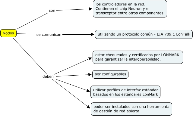 Este Cmap, tiene información relacionada con: Nodos, Nodos deben utilizar perfiles de interfaz estándar basados en los estándares LonMark, Nodos deben estar chequeados y certificados por LONMARK para garantizar la interoperabilidad., Nodos deben poder ser instalados con una herramienta de gestión de red abierta, Nodos deben ser configurables, Nodos son los controladores en la red. Contienen el chip Neuron y el transceptor entre otros componentes., Nodos se comunican utilizando un protocolo común - EIA 709.1 LonTalk